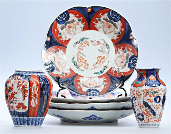 203. Dezertní talíře a vázičky z japonského porcelánu Imari