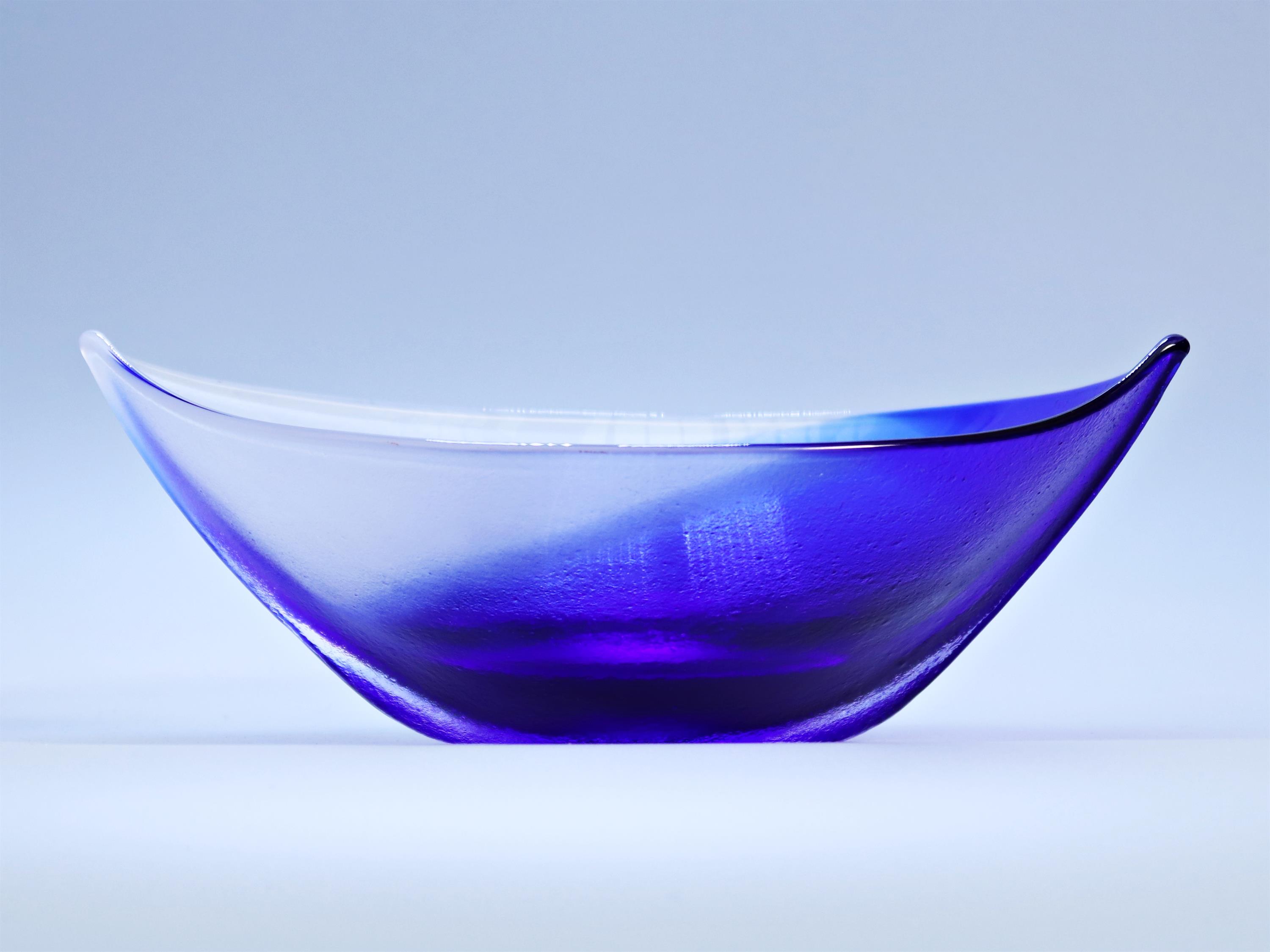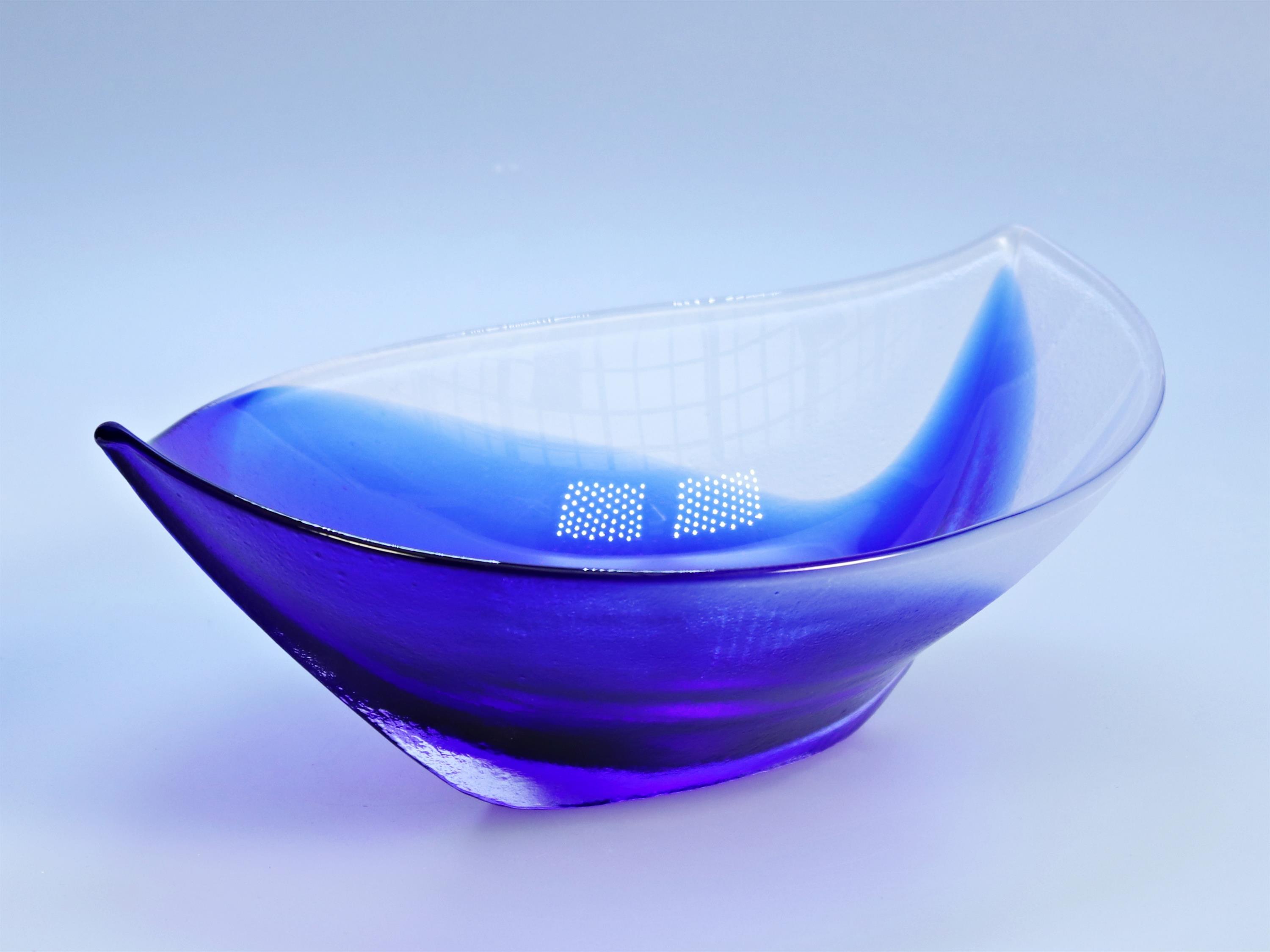 Mísa z modrého skla ve tvaru lodi s označením Maleras