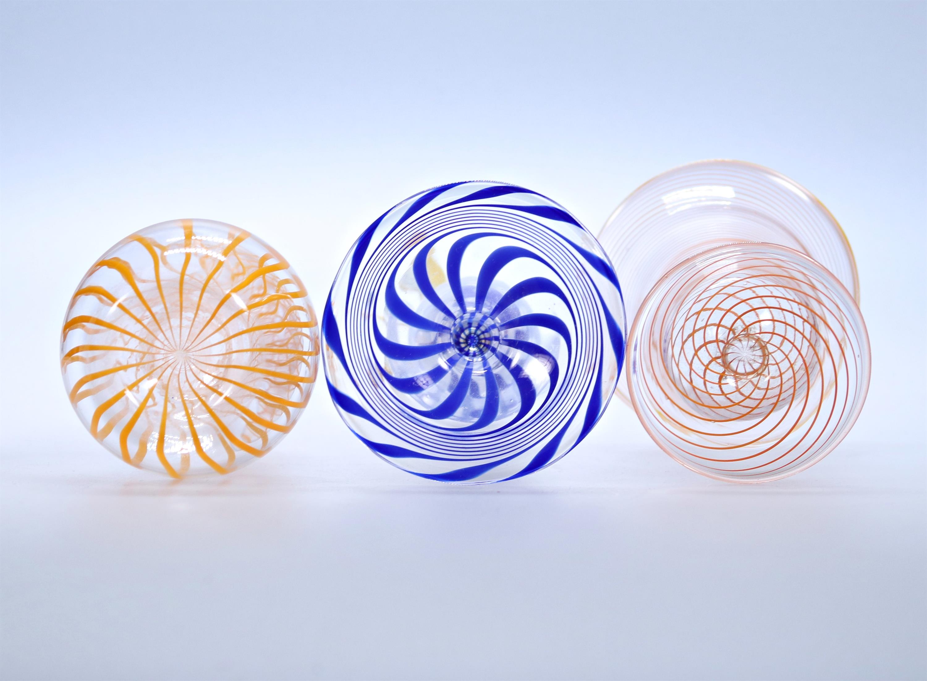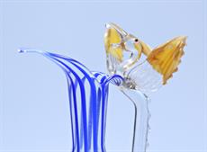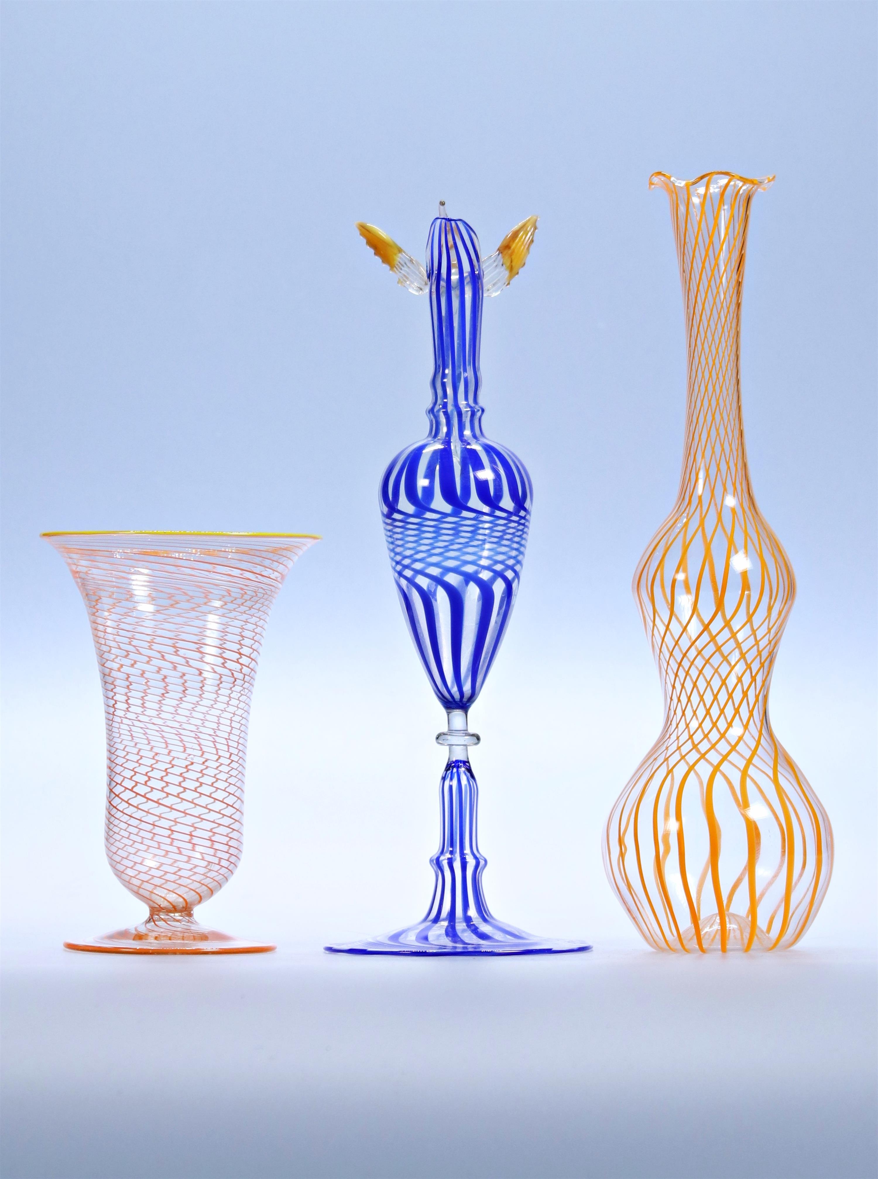čiré sklo s barevnými liniemi, jedna váza zdobená plastikou