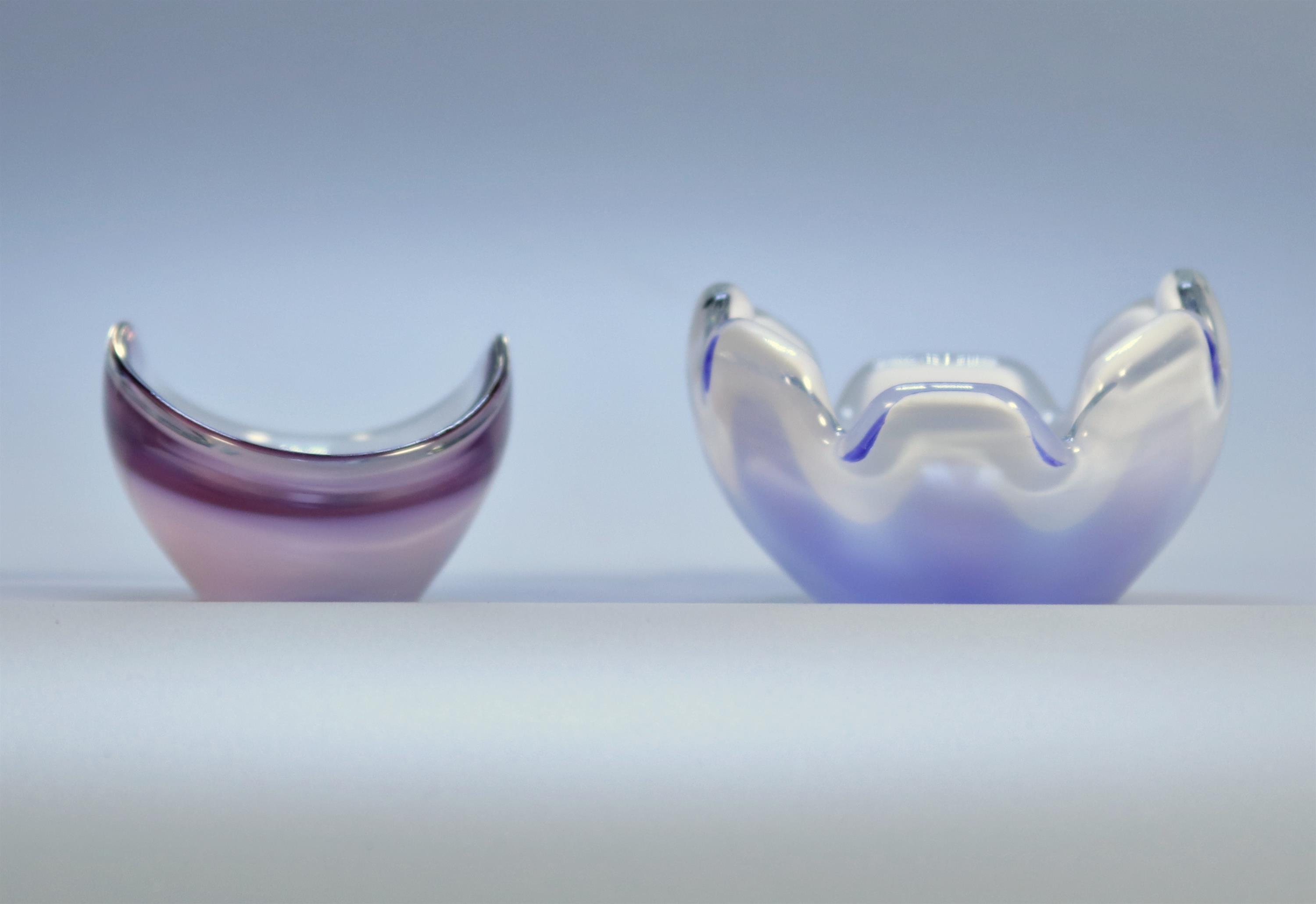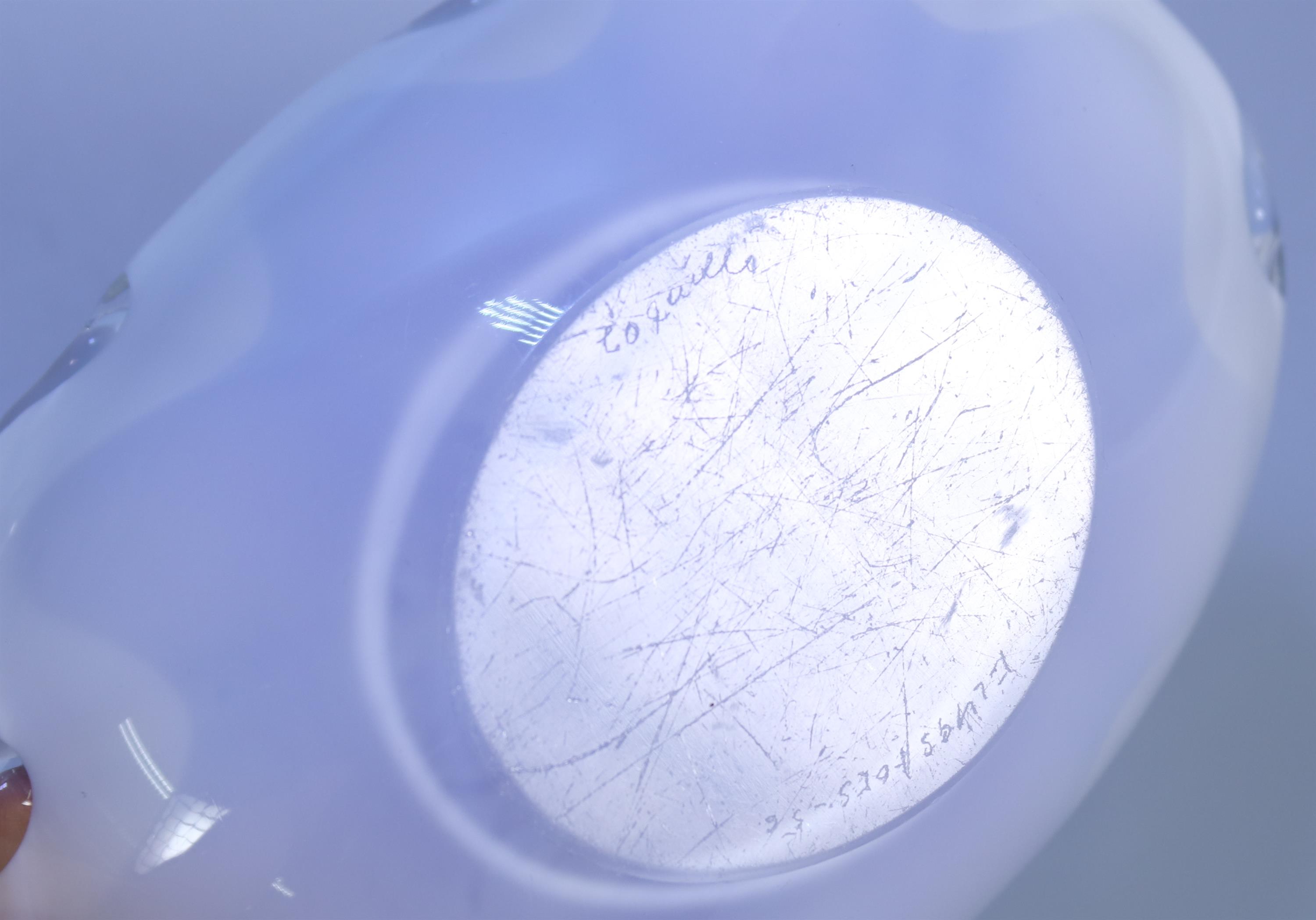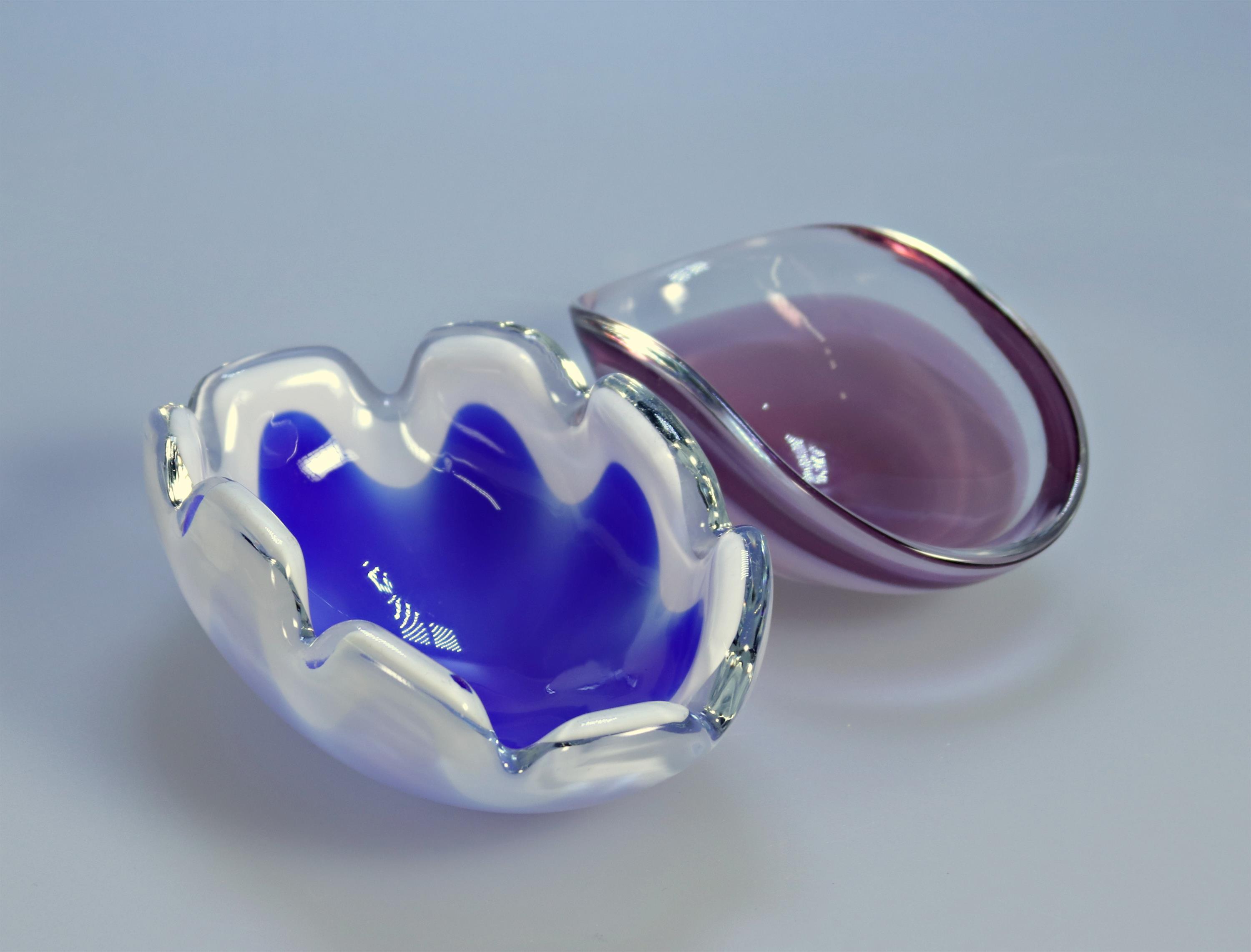 modrá a fialová ozdobná miska, zespodu vyryt výrobce Coquille Flygsfors
