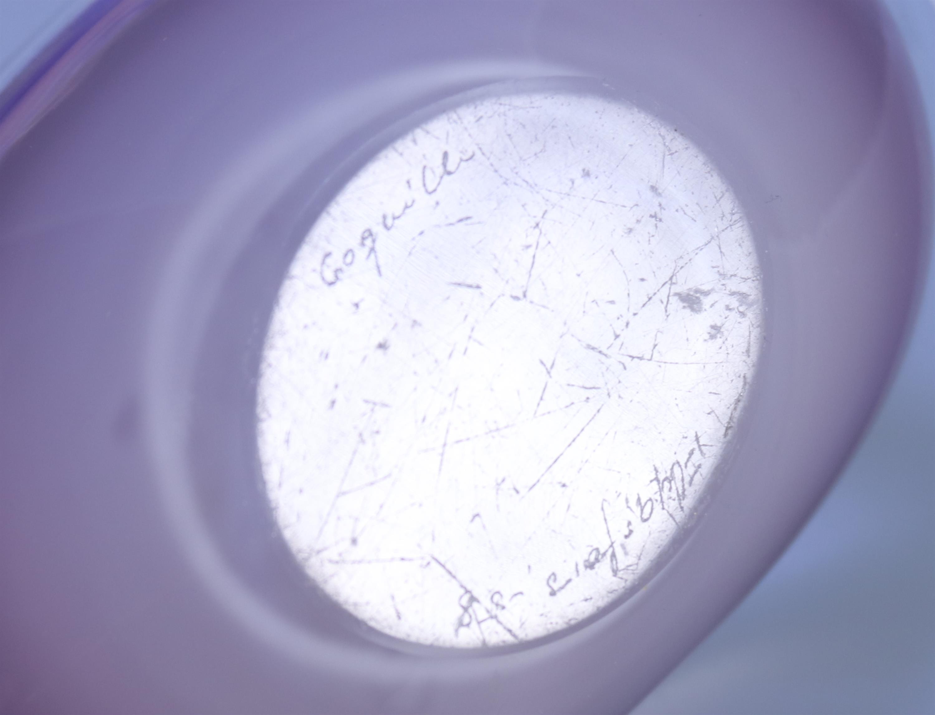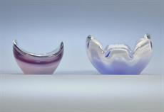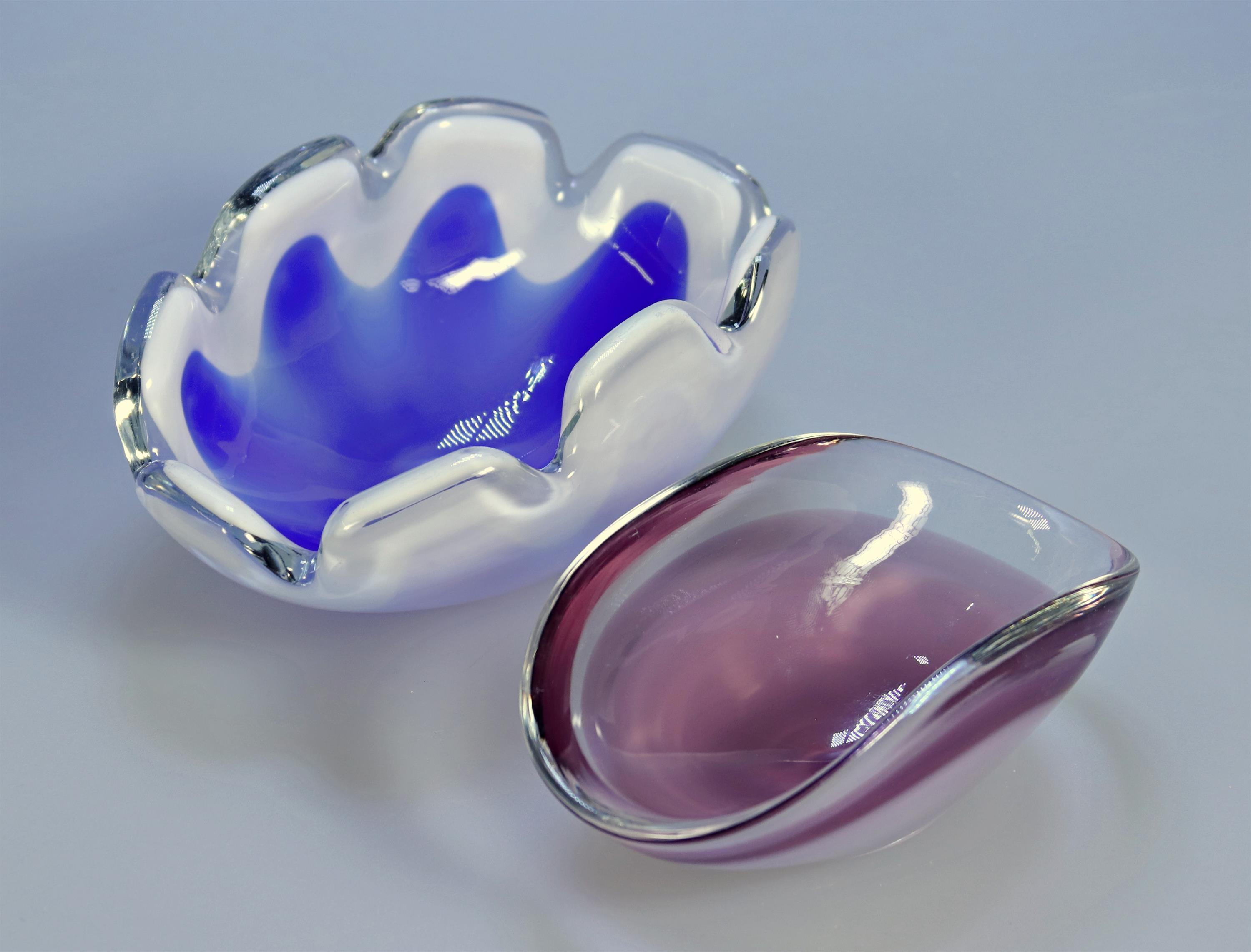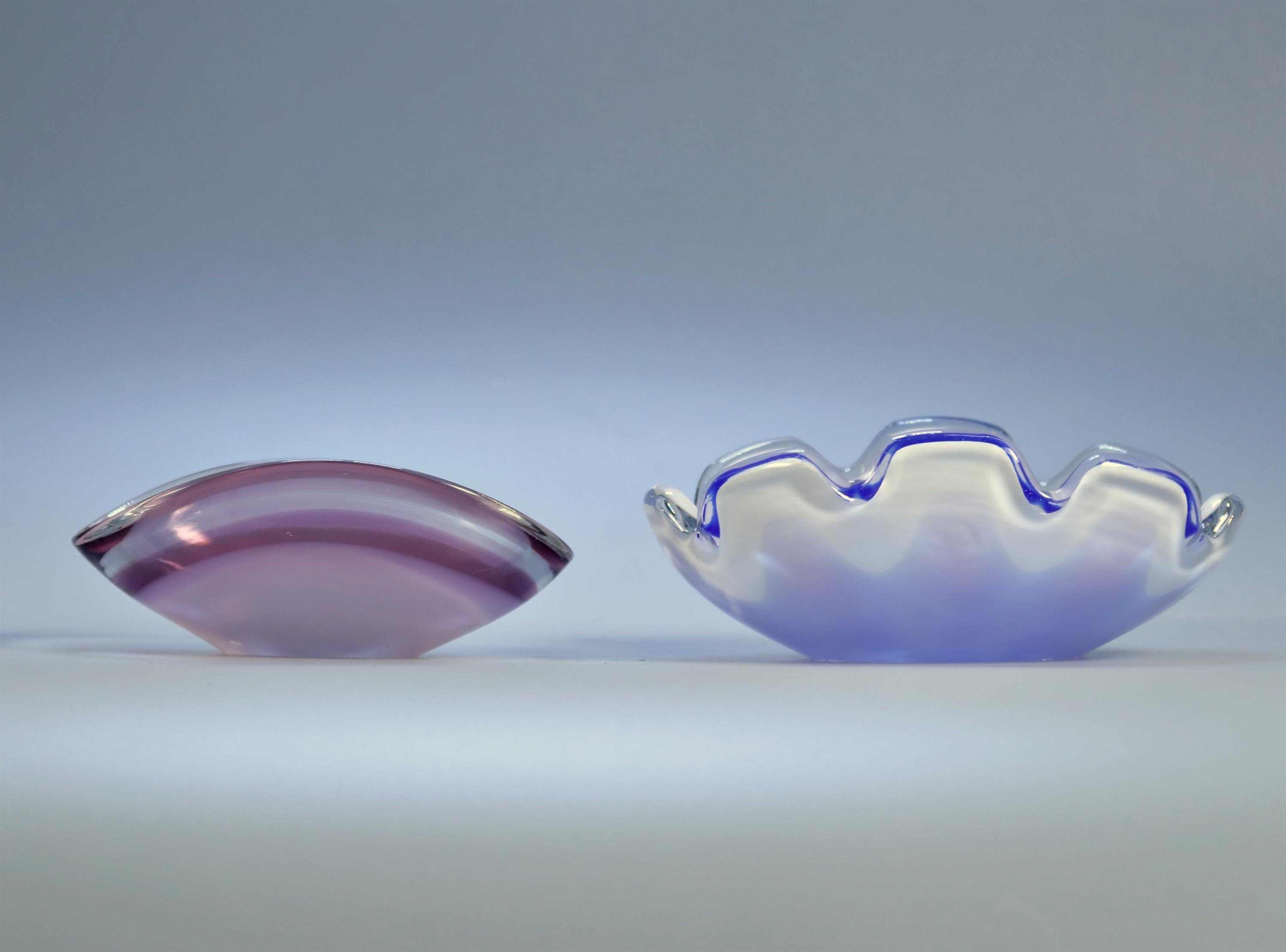 modrá a fialová ozdobná miska, zespodu vyryt výrobce Coquille Flygsfors