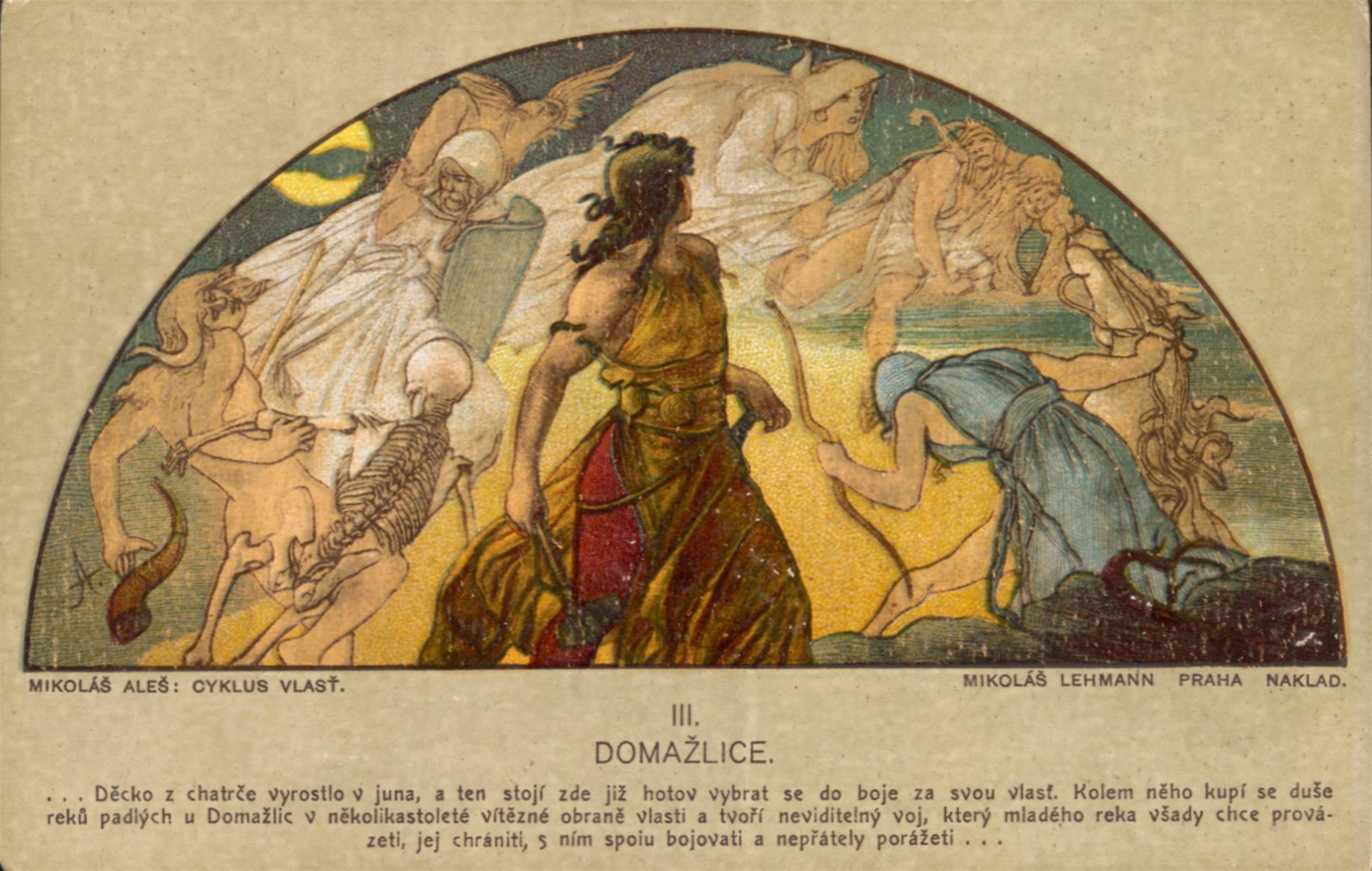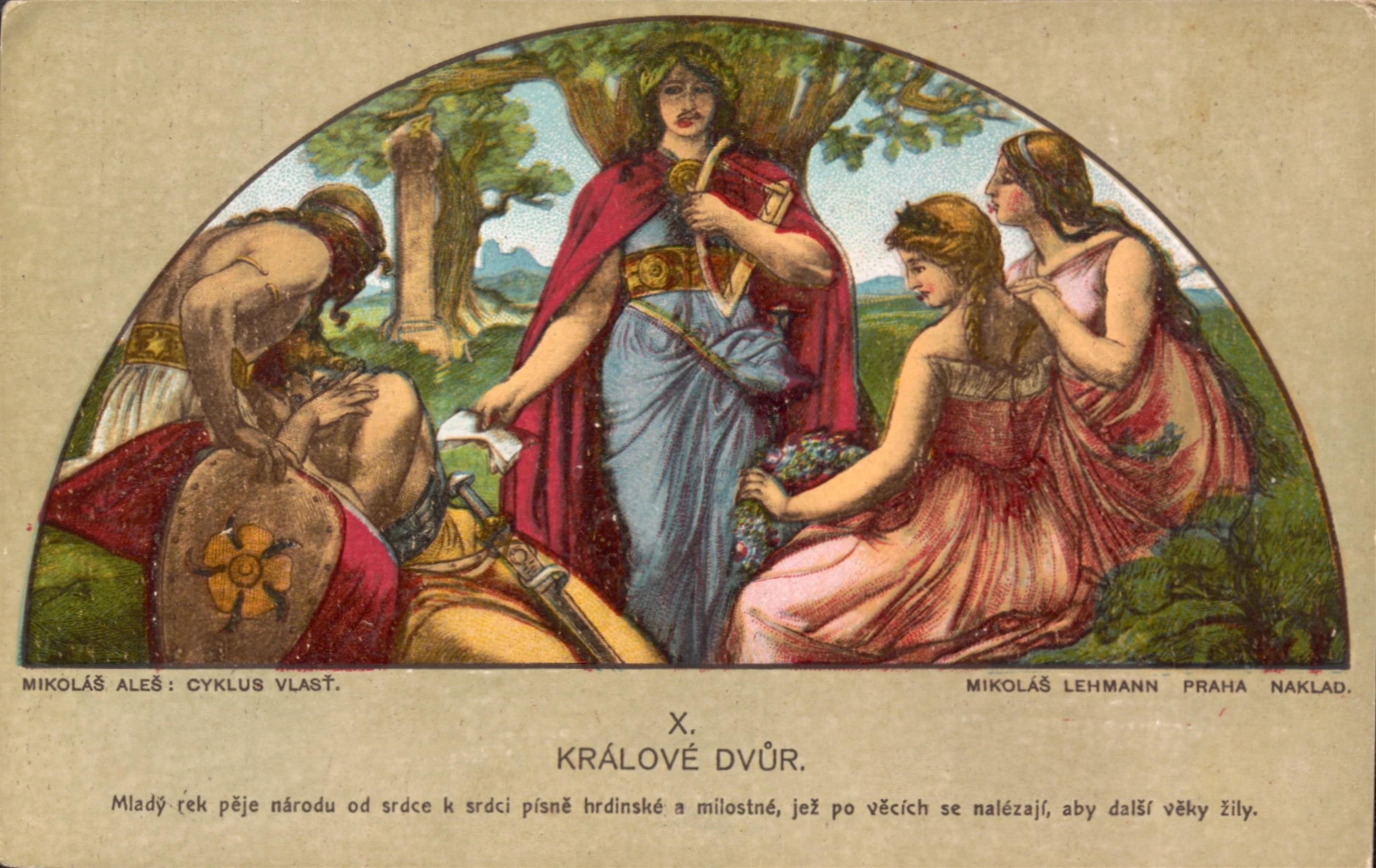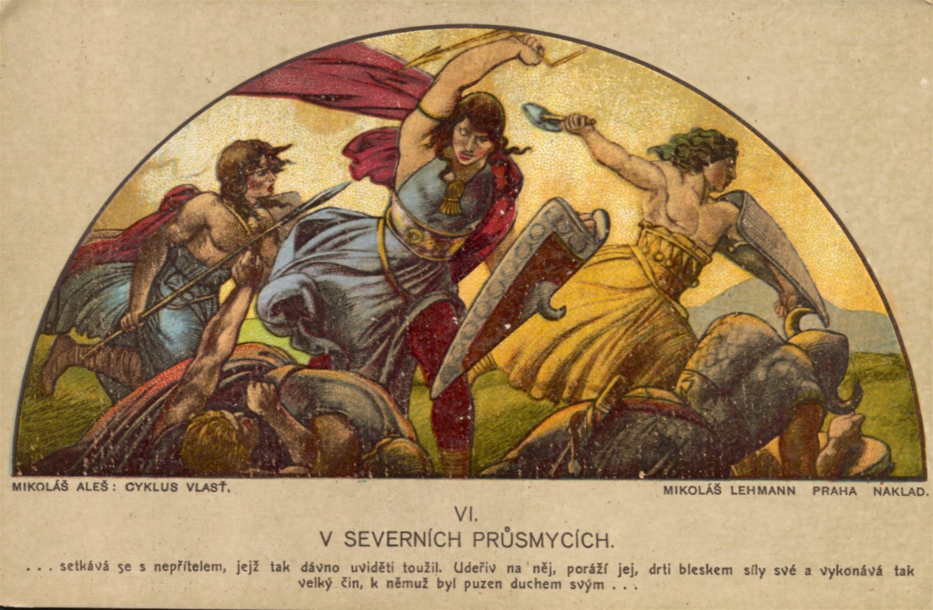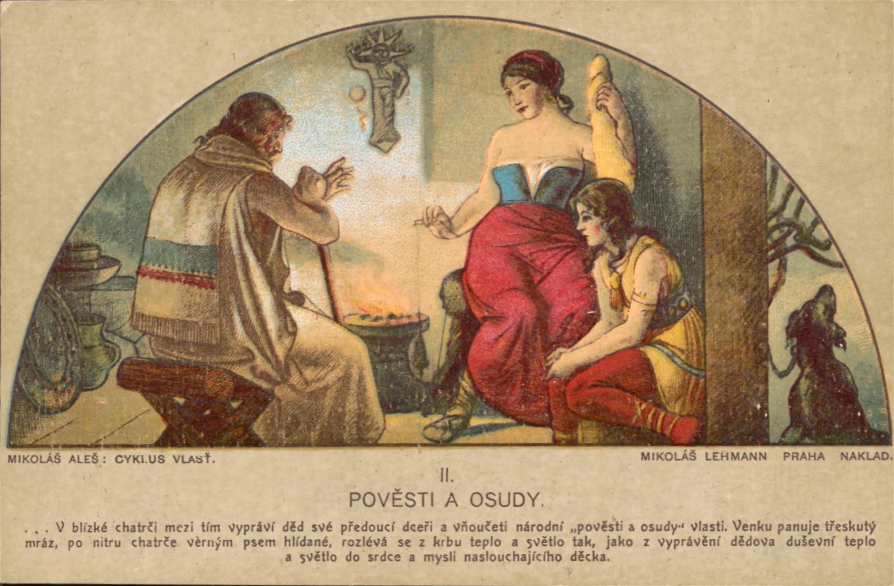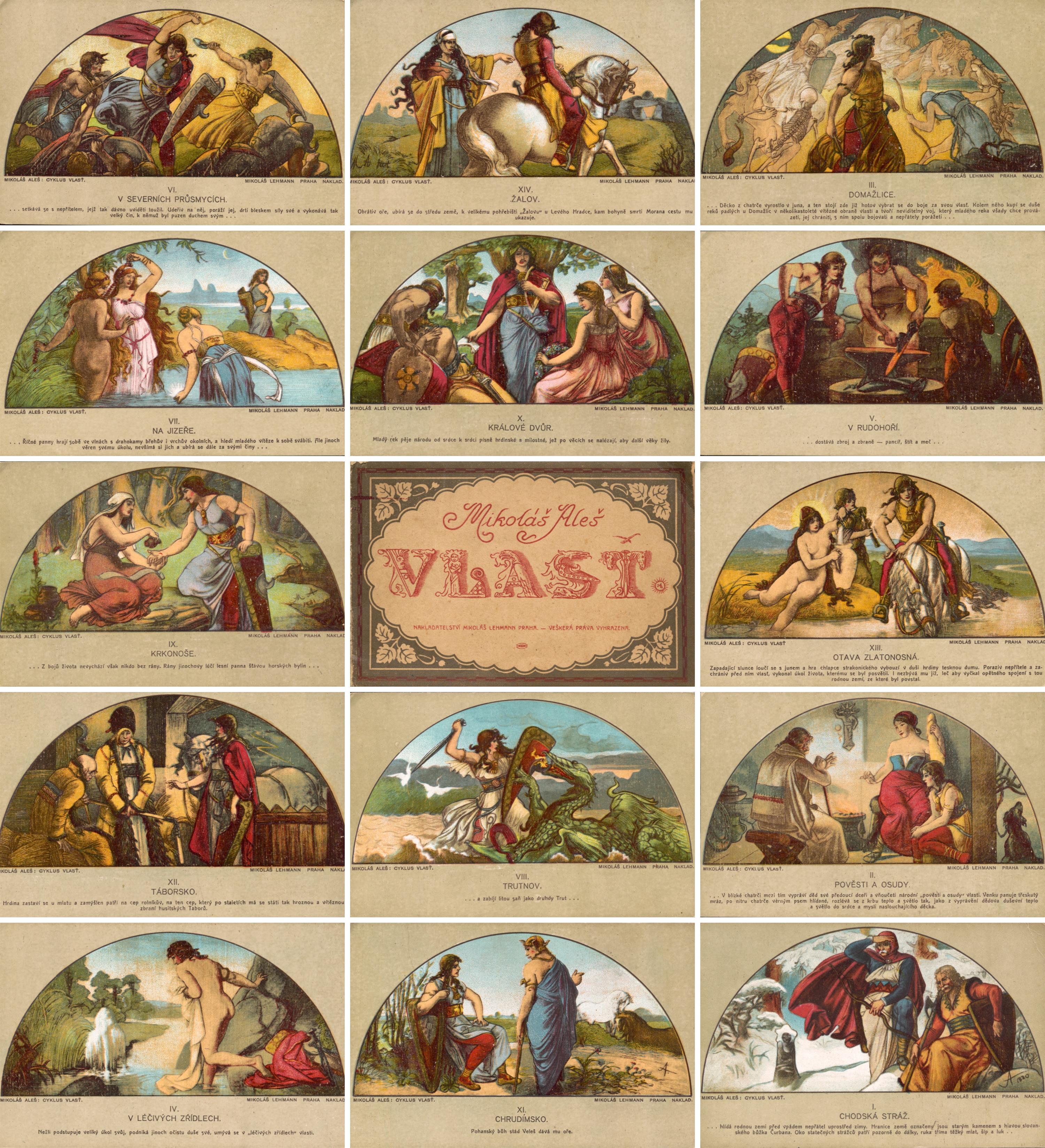 soubor barvných pohlednic s motivy z Cyklusu Vlast od Mikoláše Aleše, vydáno Mikolášem Lehmannem v Praze, celkem 14 kusů v původních deskách