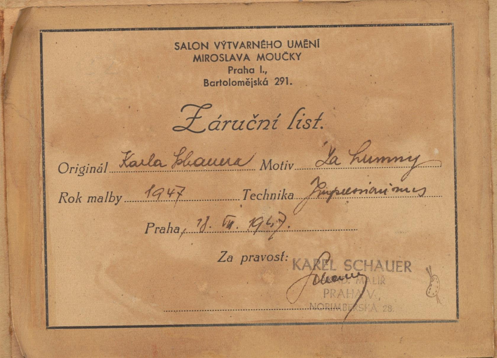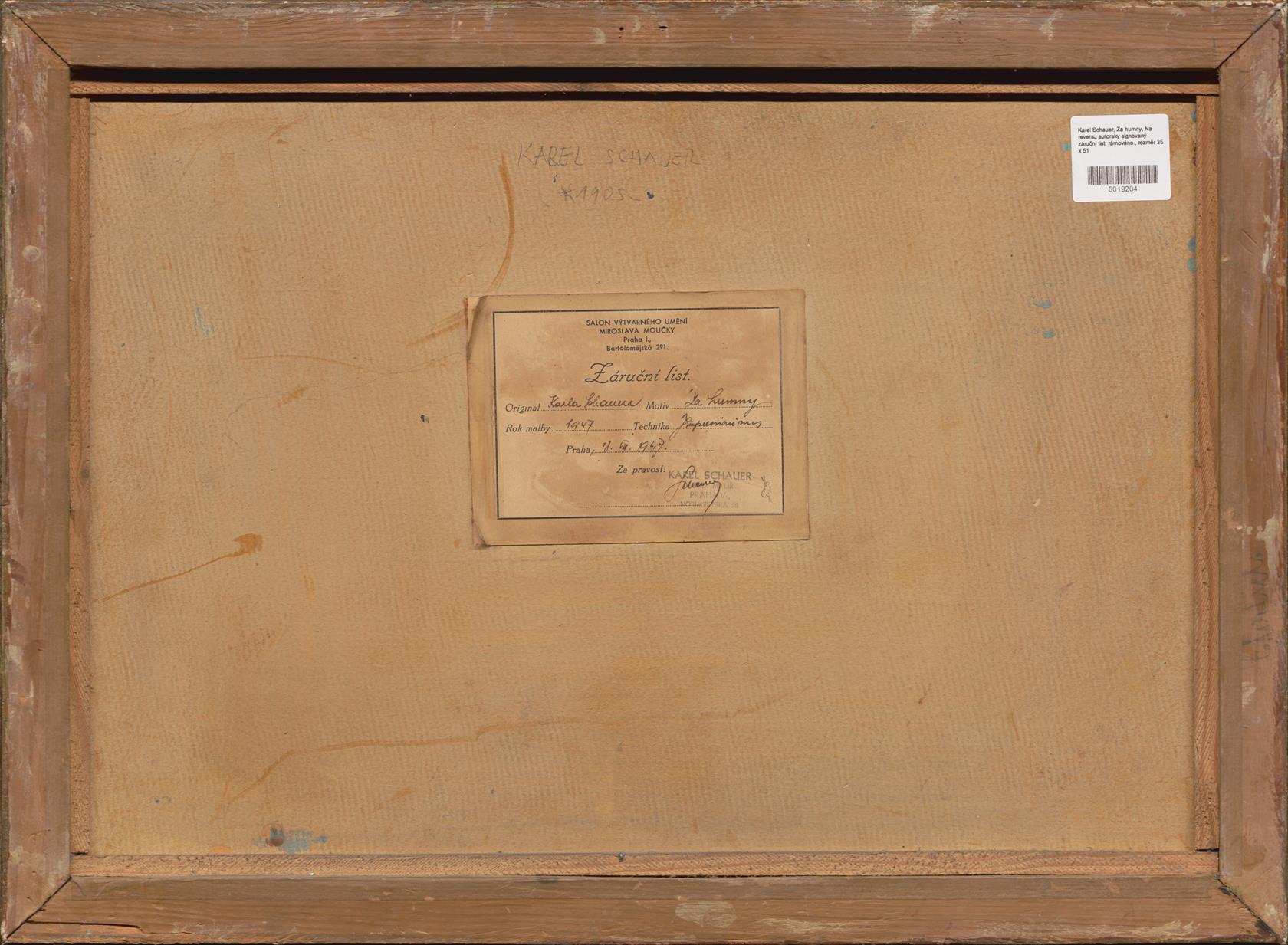 Na reversu autorsky signovaný záruční list, rámováno.