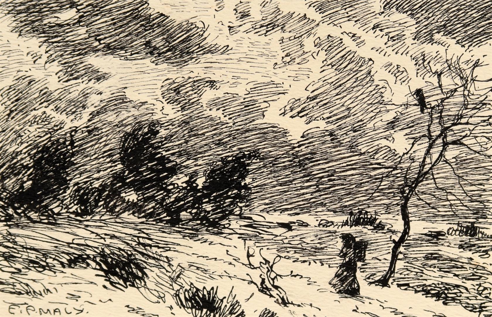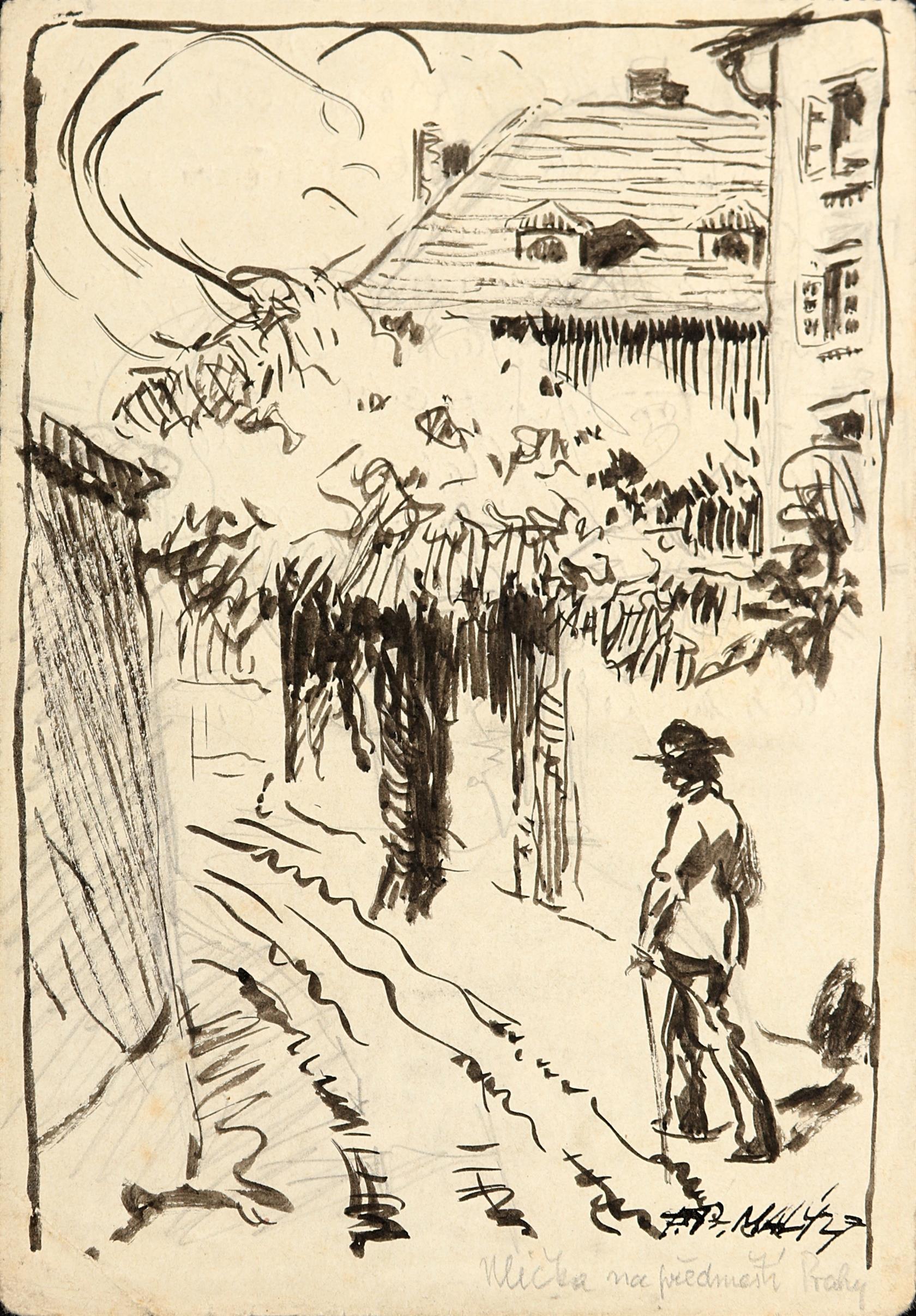 2. Ulička na předměstí Prahy, tuš, 14,5 x 10 cm