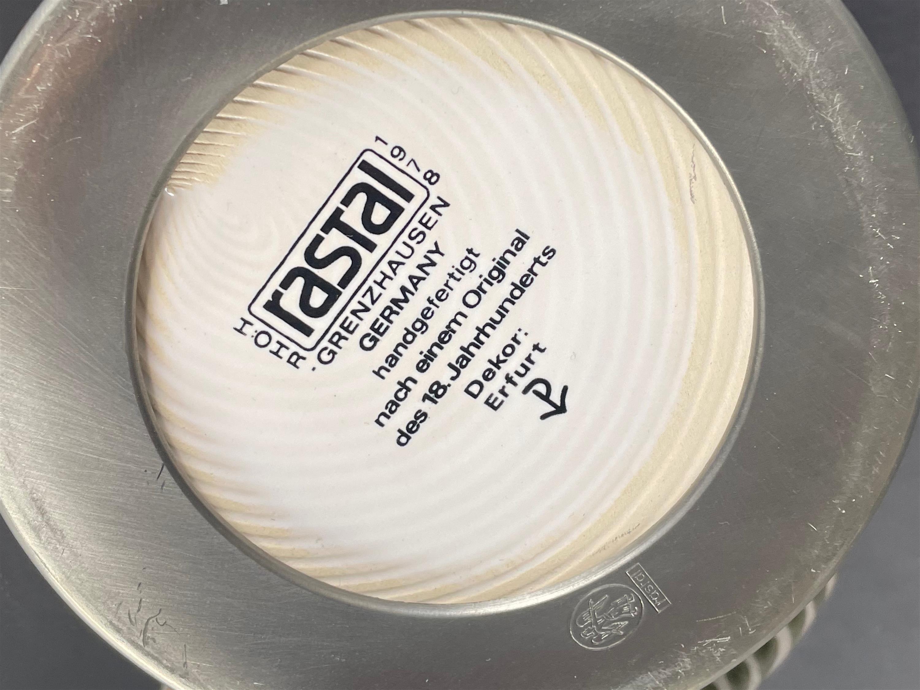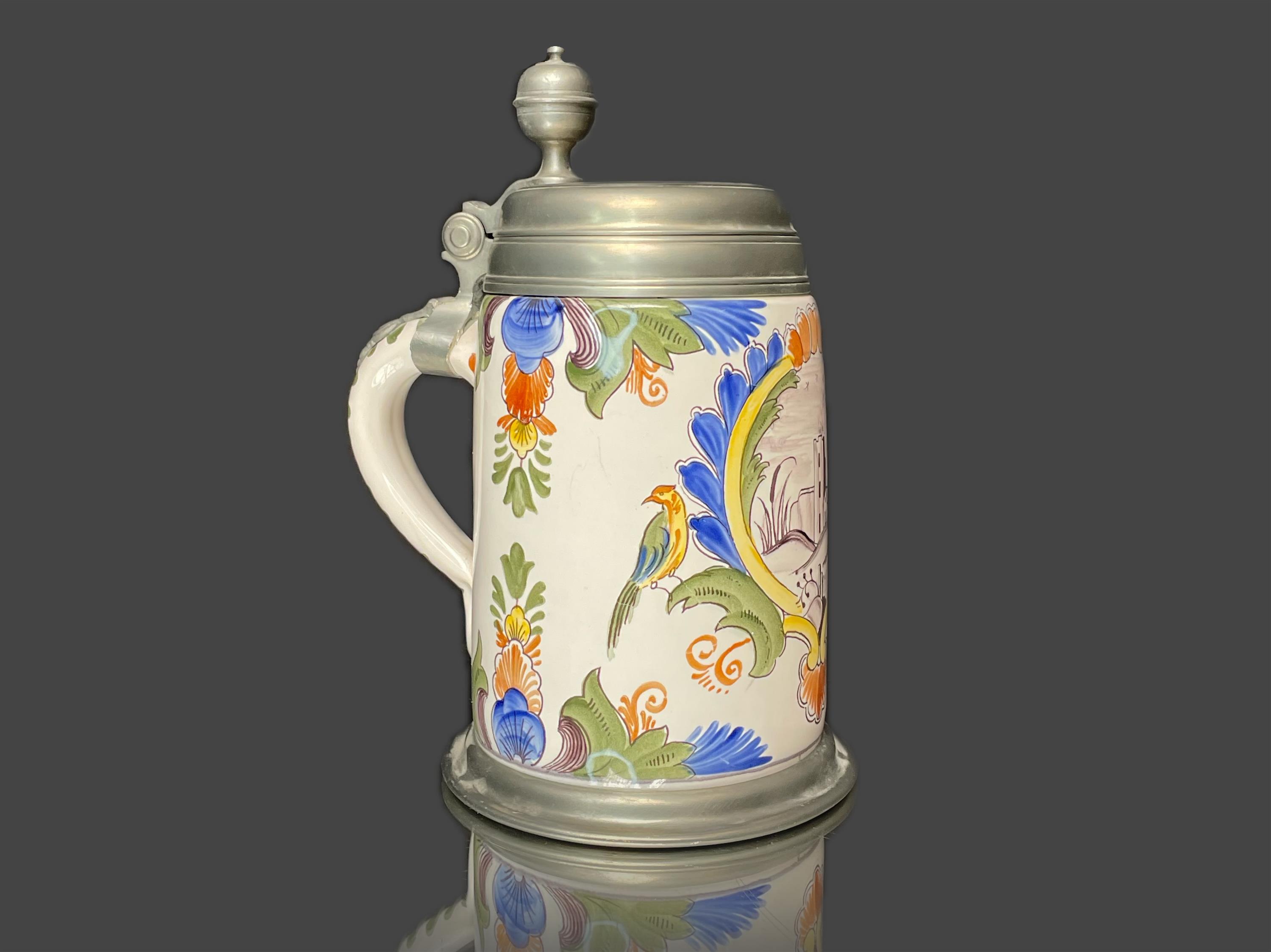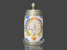 Keramický malovaný korbel s cínovým víčkem, značeno.