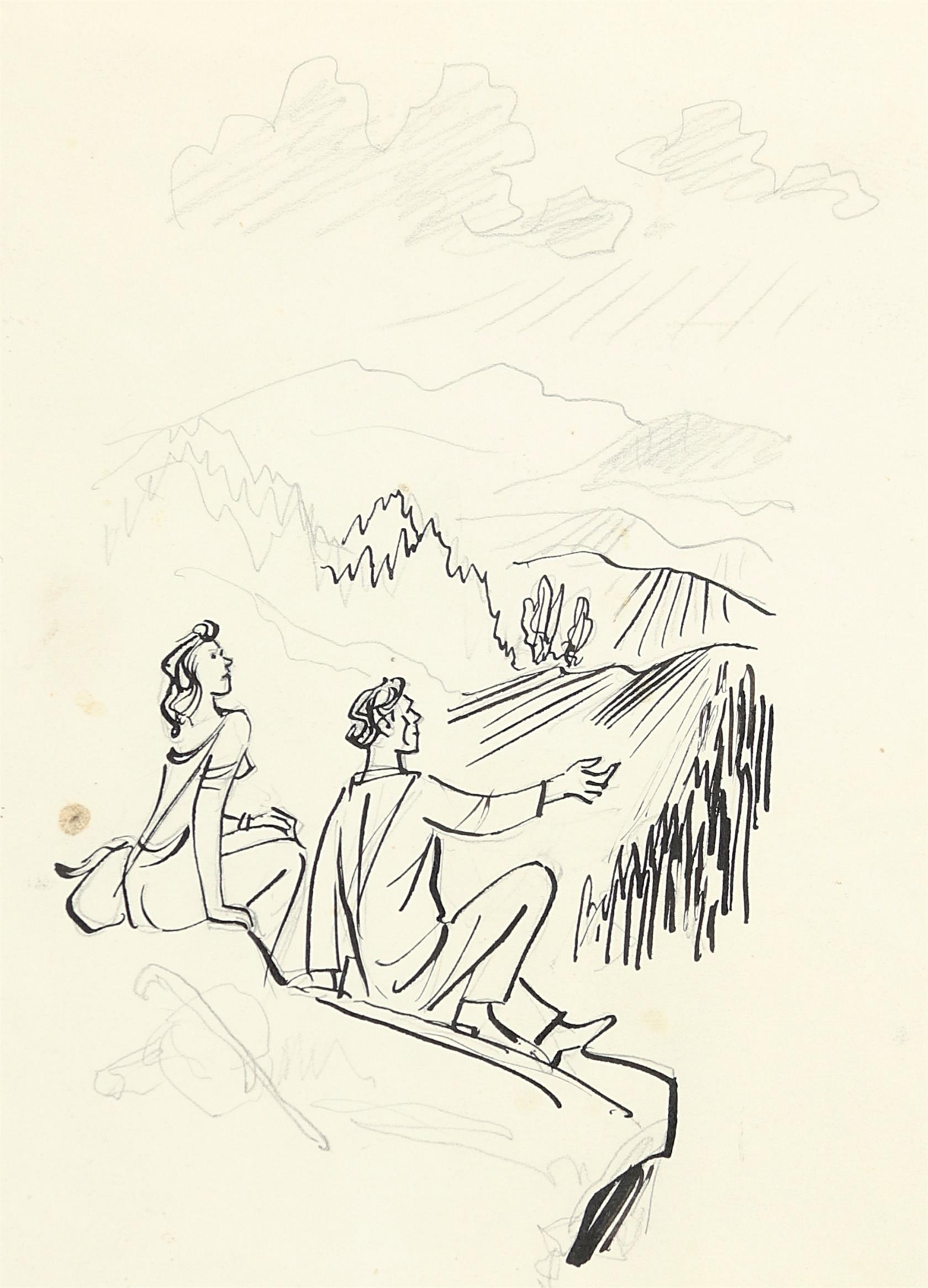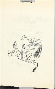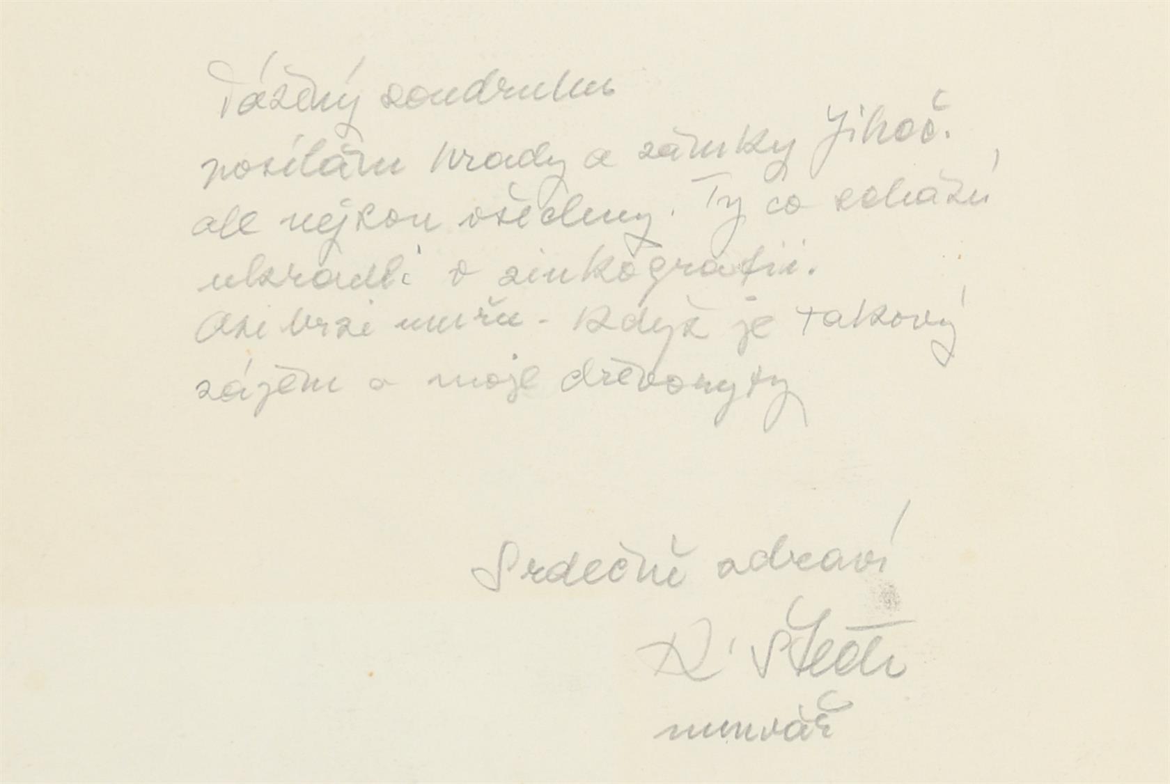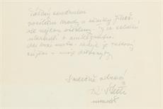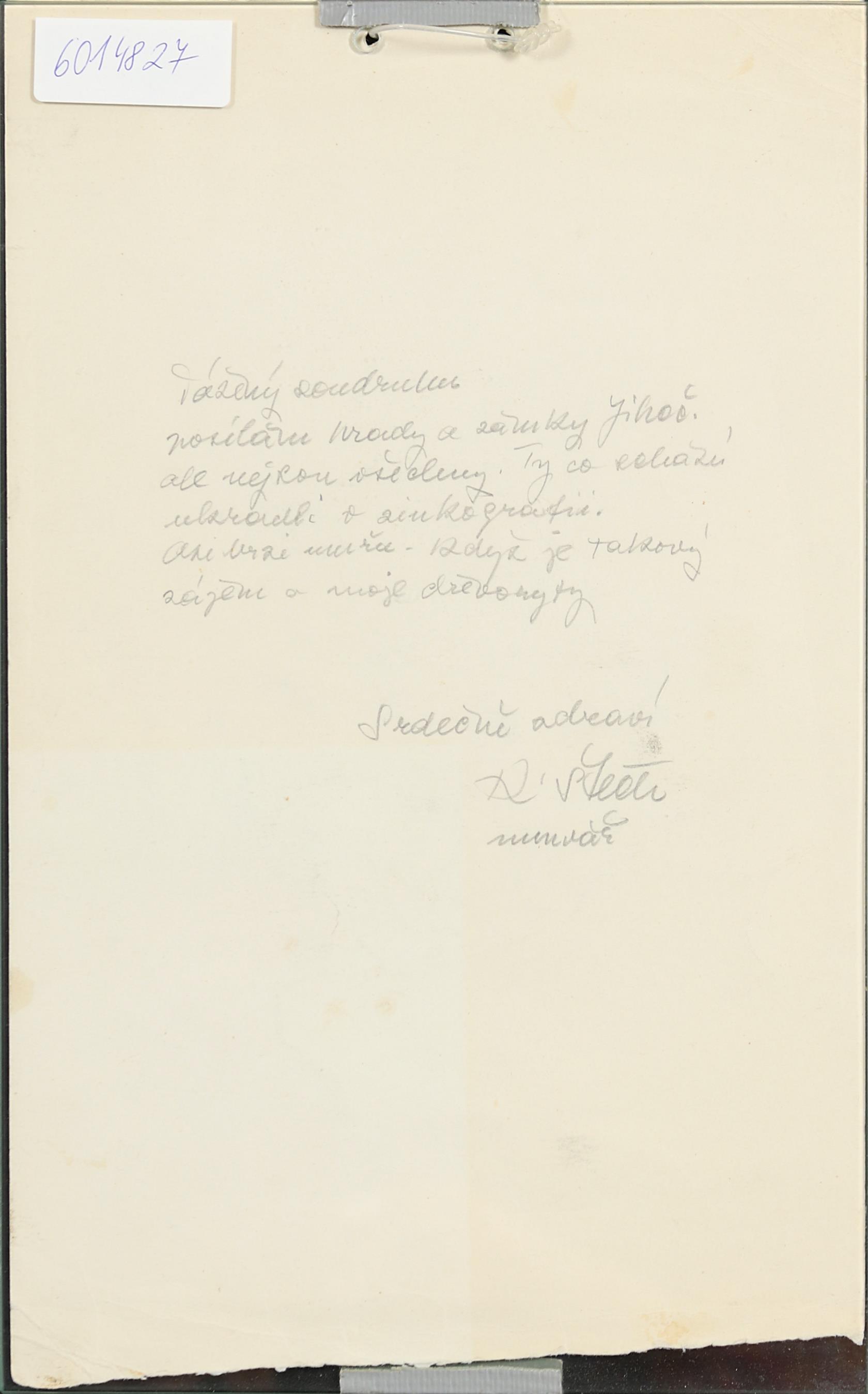 na reversu věnování psané tužkou včetně signace, kresba vložena mezi dvě skla, kresba tužkou a tuší