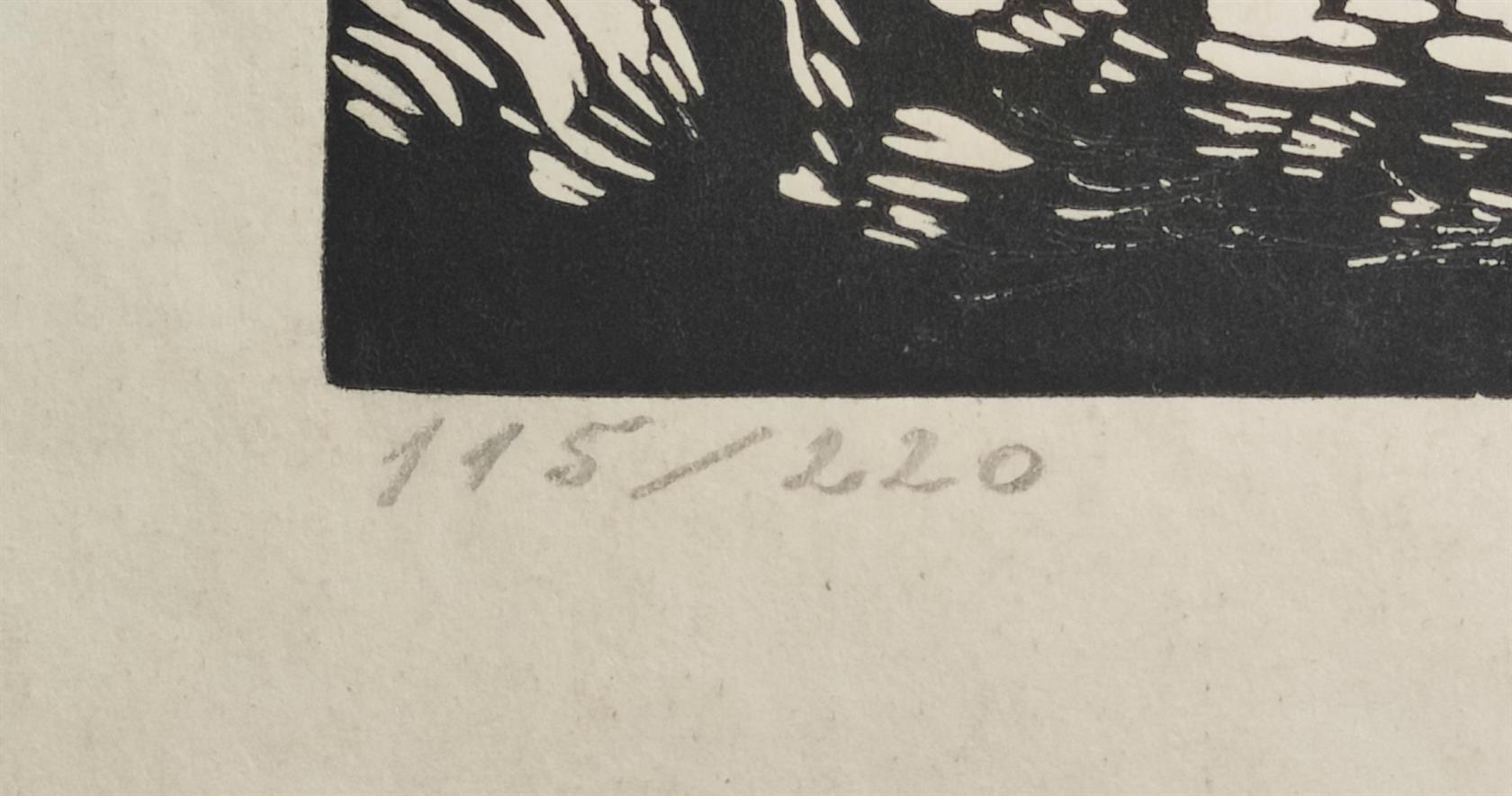 Vlevo dole pod paspartou je číslování 115/220. Signováno vpravo dole pod paspartou, paspartováno, zaskleno, rámováno