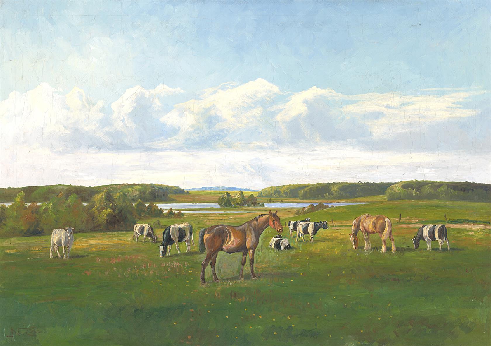 Koně a krávy na pastvě - L Formát