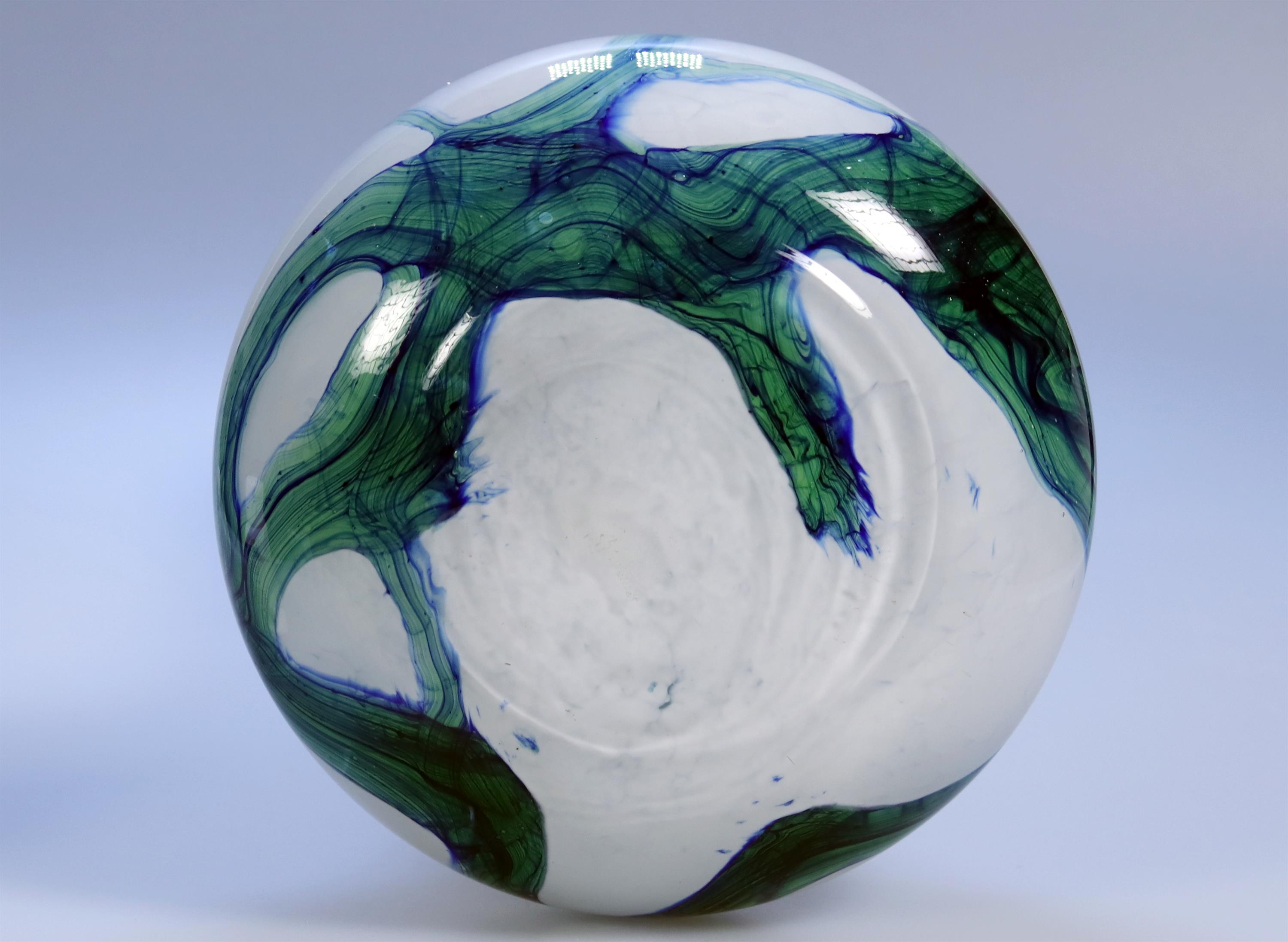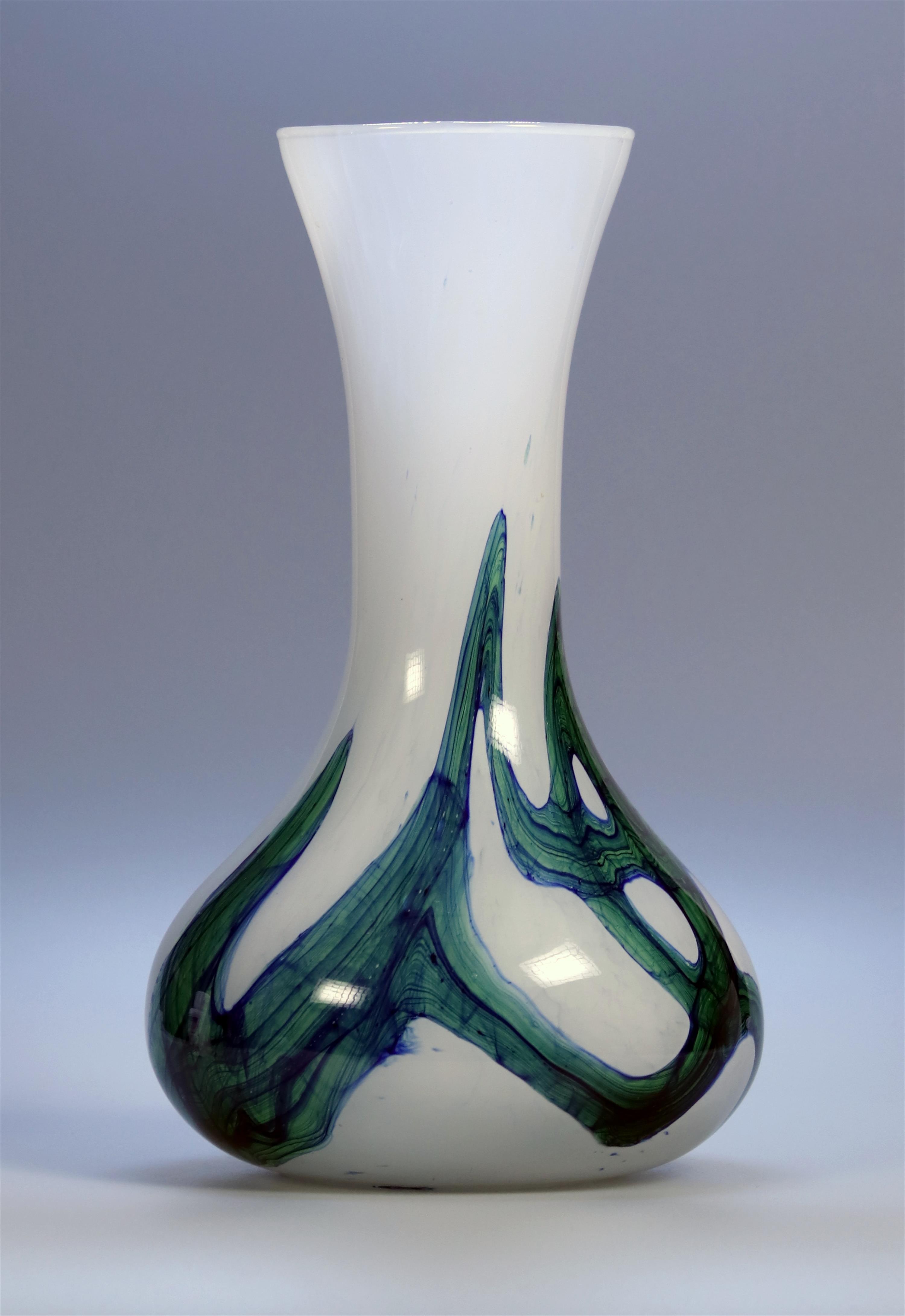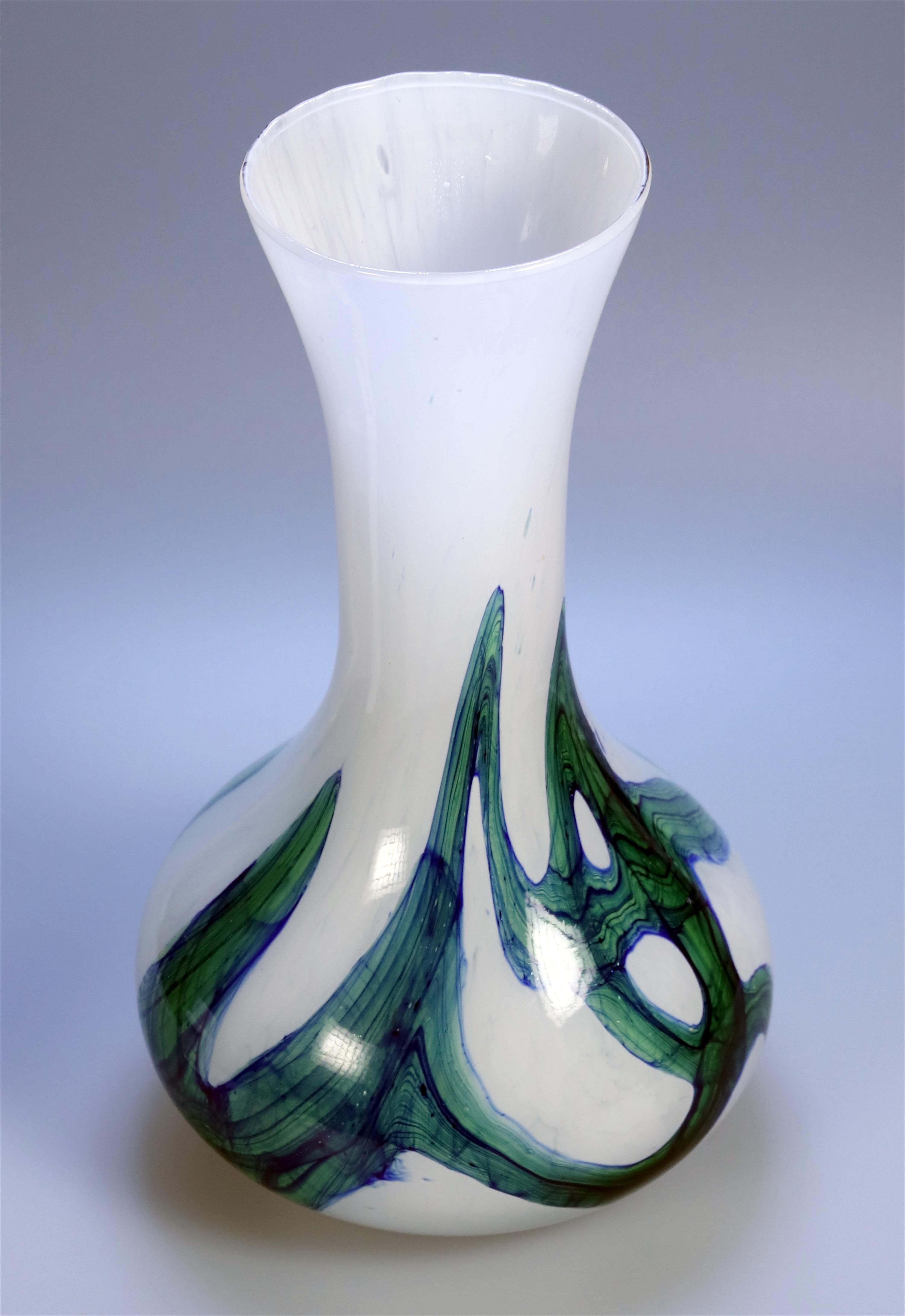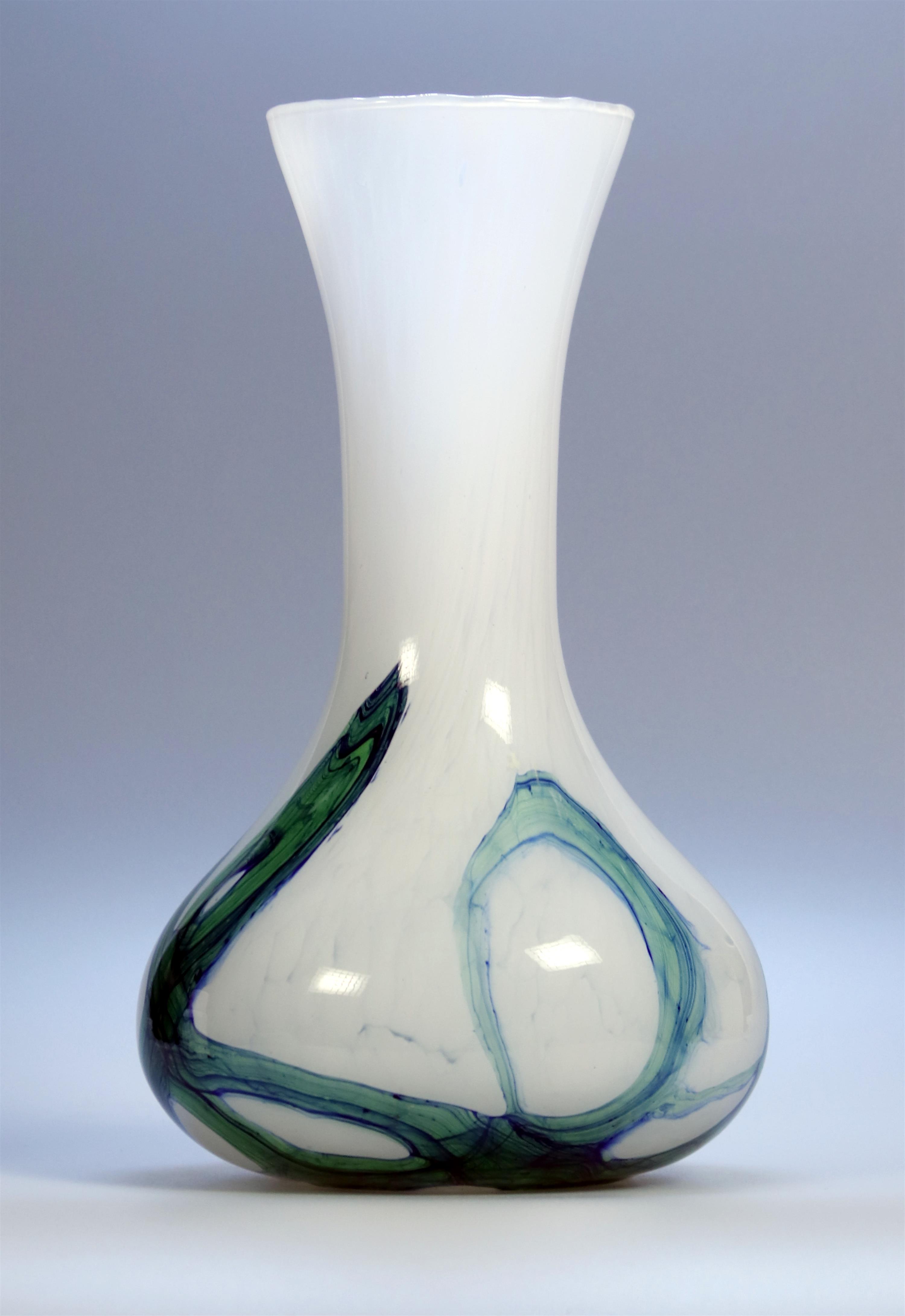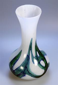 Skleněná váza z mléčného skla se zeleno modrou aplikací
