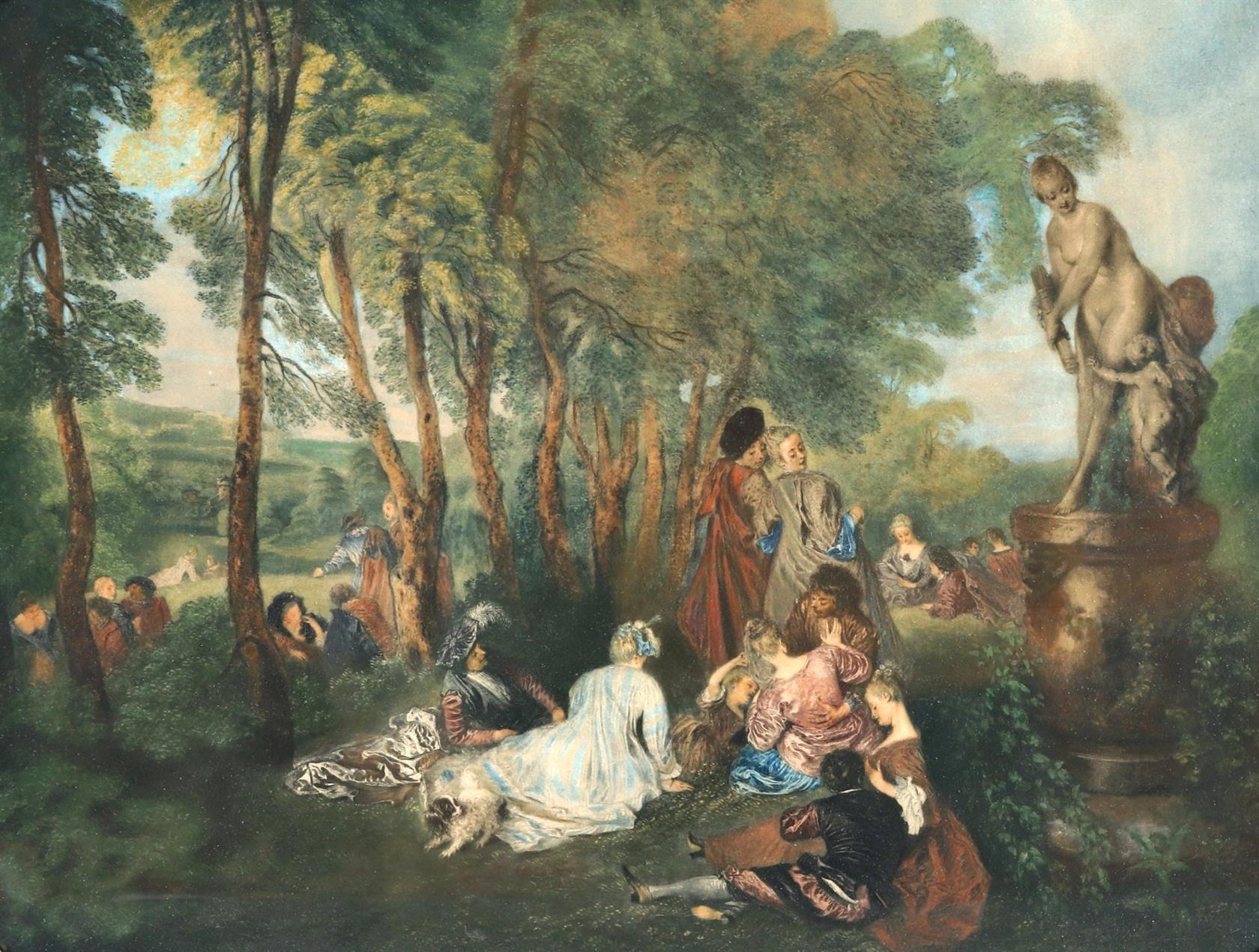 Rámováno, pod sklem, chromovaný litografický tisk "Svátek lásky" od Antione Watteau, bronzový rám