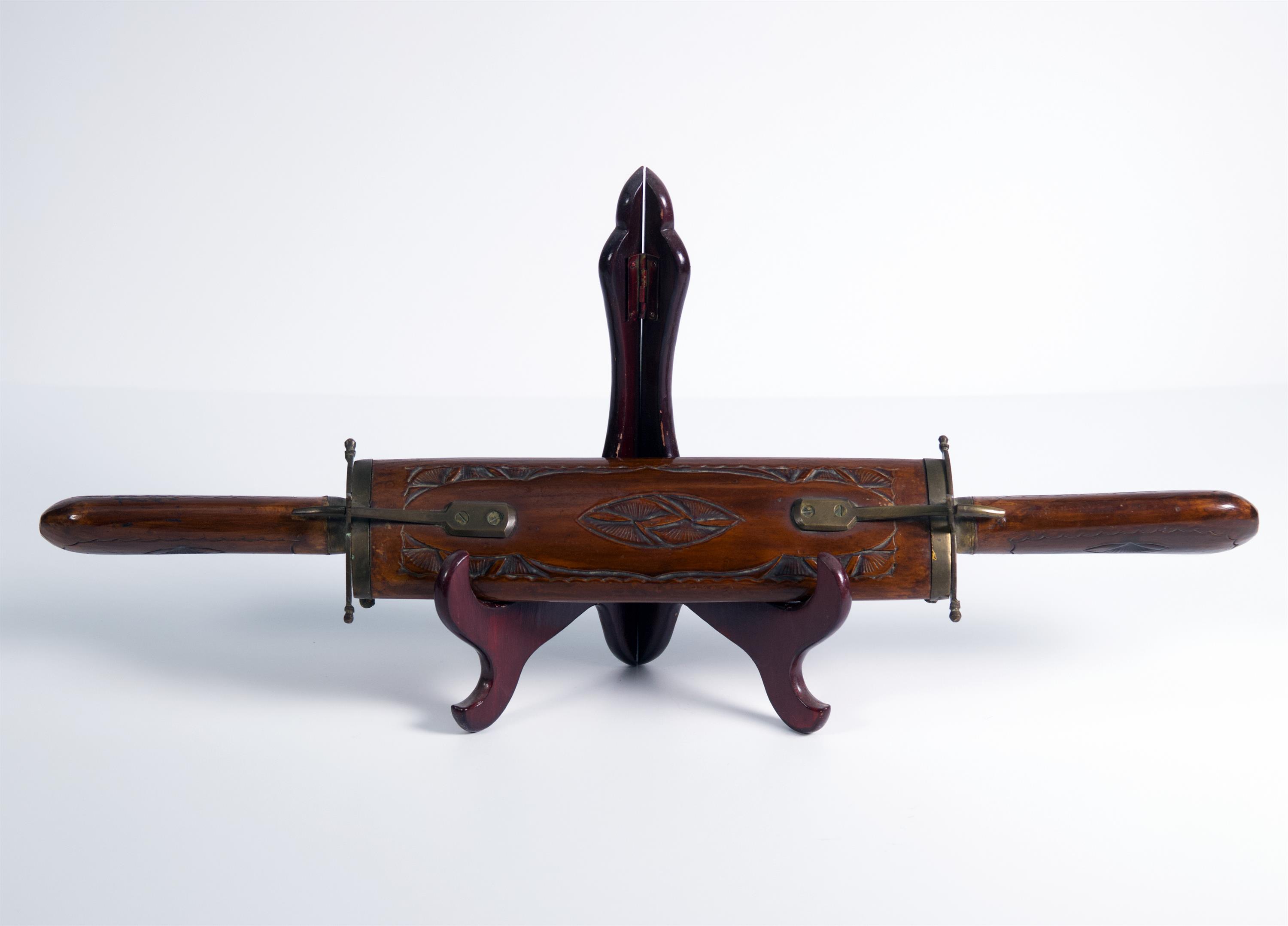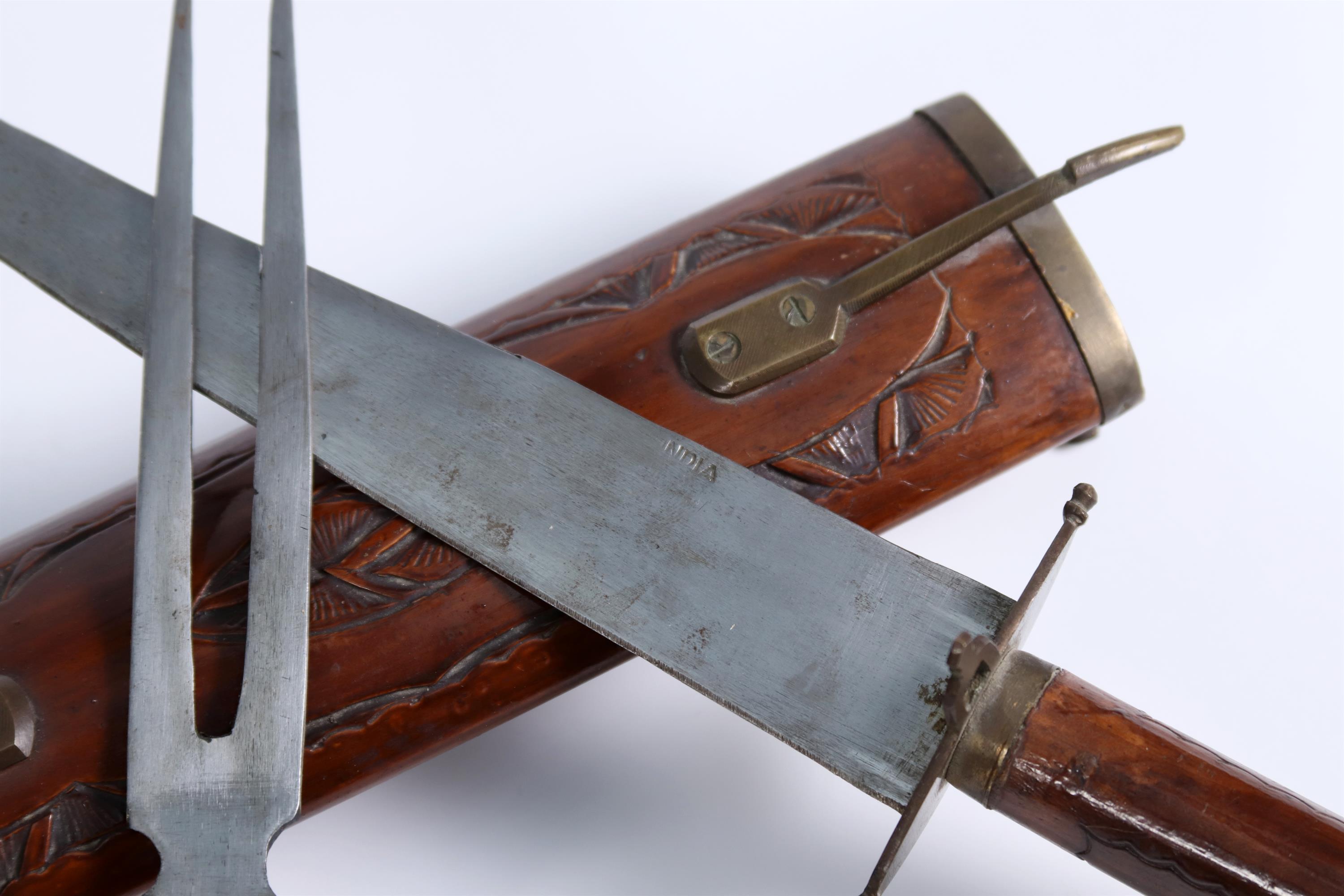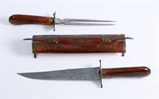 Nůž, vidlička a pouzdro z vyřezávaného dřeva s mosaznou kombinací. Dřevěný stojánek není součástí prodeje