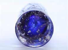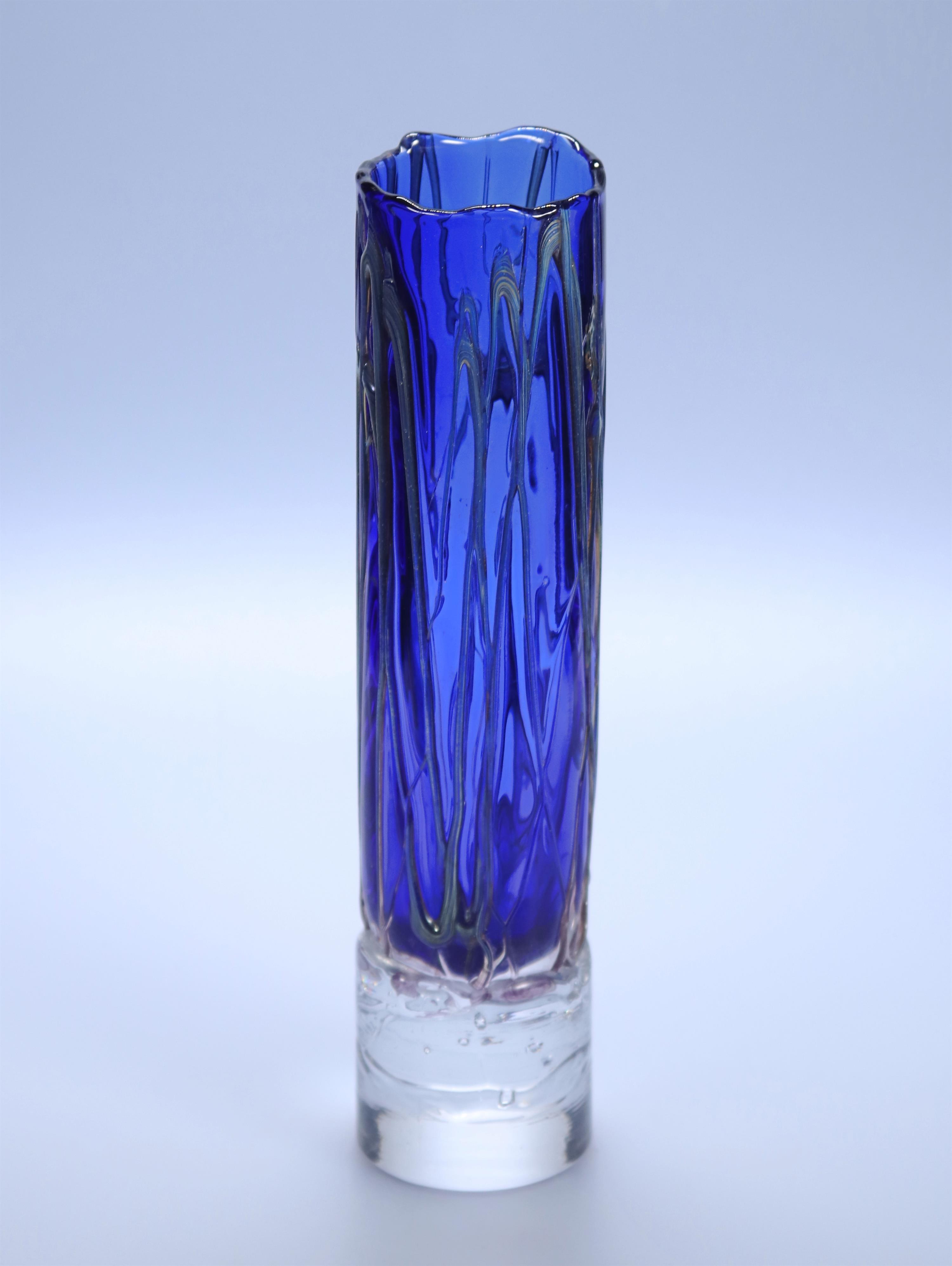 Váza s kobaltově modrým jádrem. Opřádaná po obvodu stříbřitými skleněnými nitěmi.