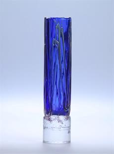 Skleněná vyšší užší váza válcovitého tvaru se silnostěnnou masivní křišťálovou základnou.