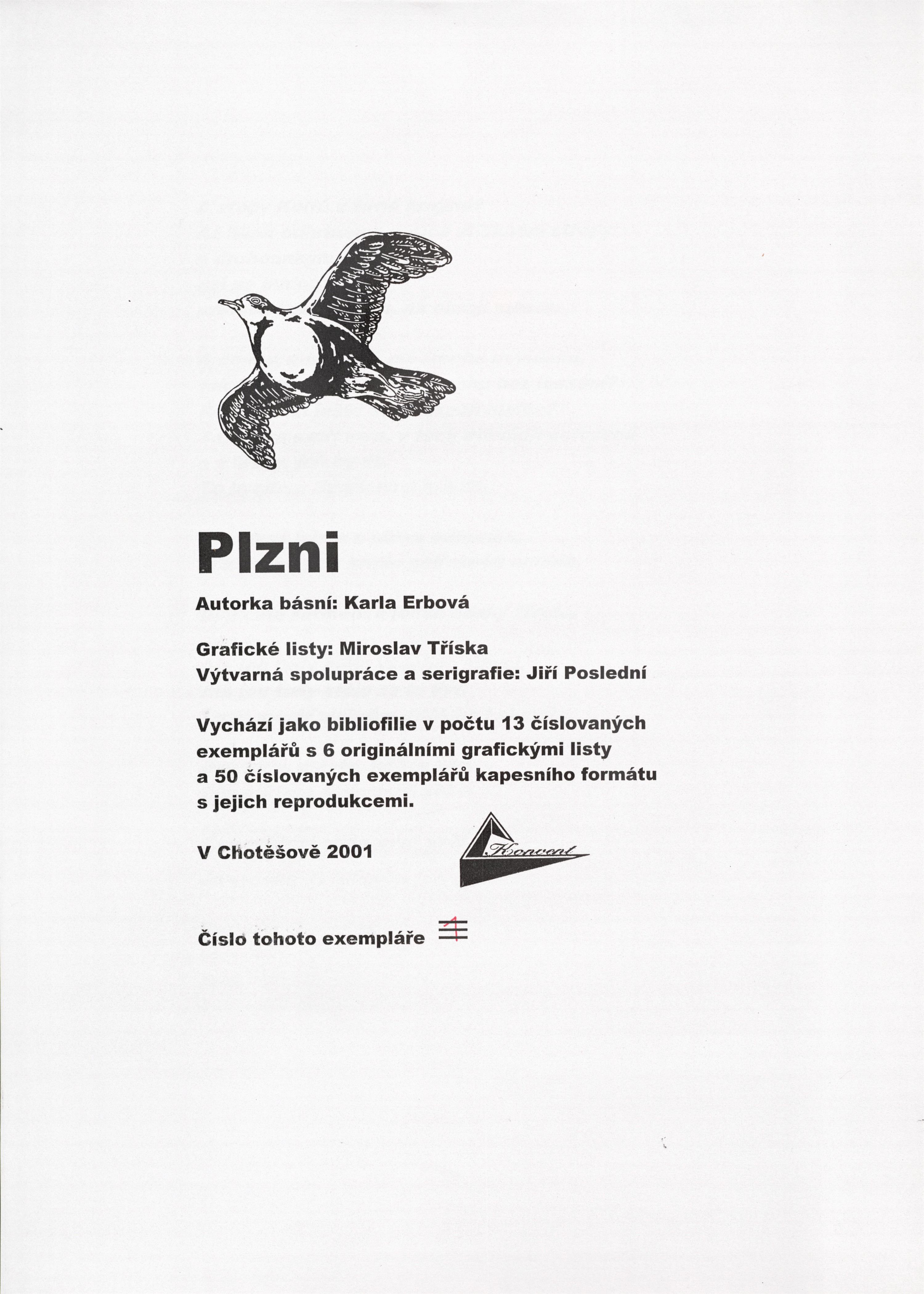Autorka básní Karla Erbová, grafické listy: Miroslav Tříska (signováno a značeno). Pochází ze sbírky z pozůstalosti básnířky Karly Erbové.