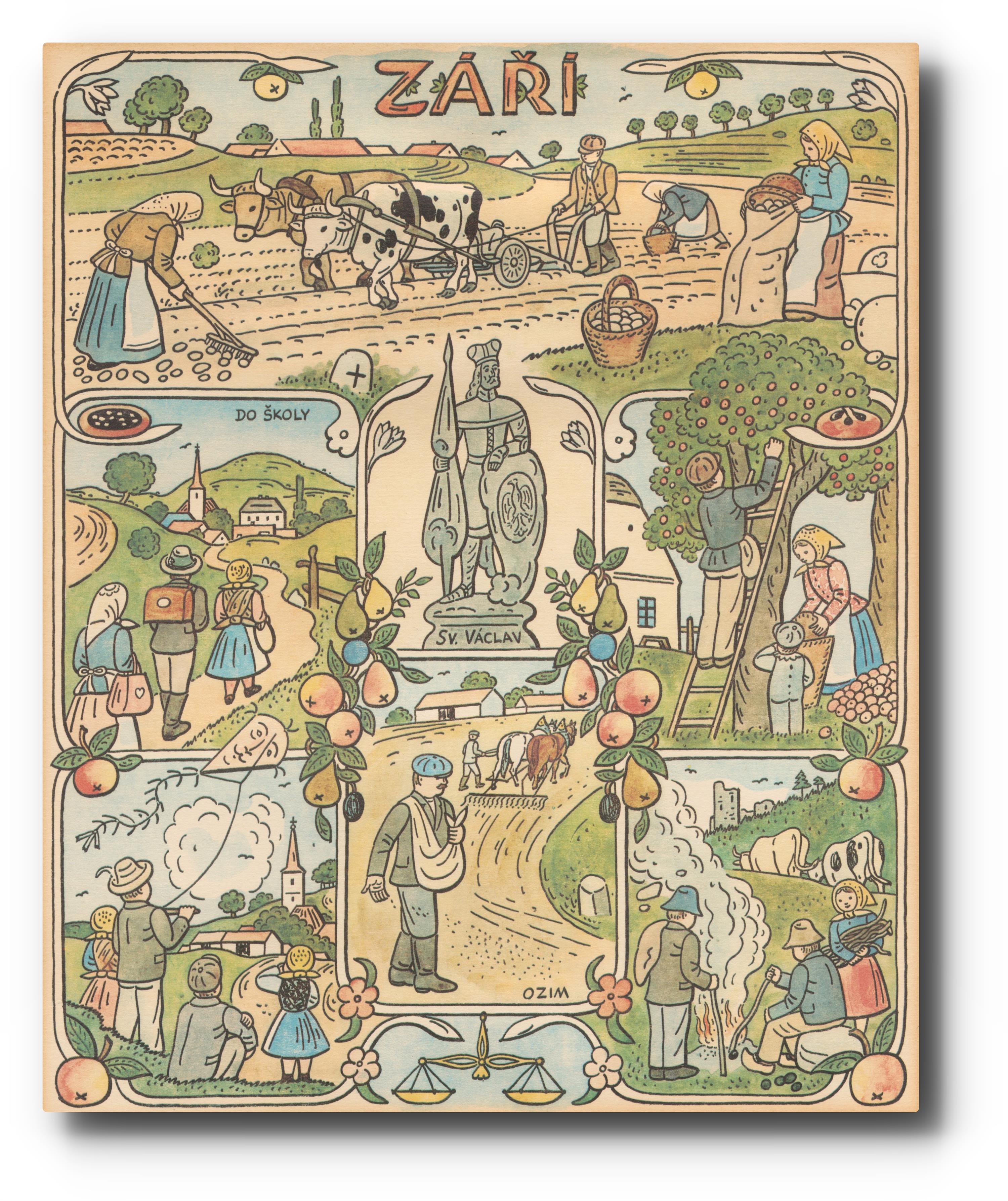 Na reversu přípis: Měsíční nástěnný kalendář 1971, reprodukce kolorované kresby z roku 1941. Paspartováno a zaskleno.