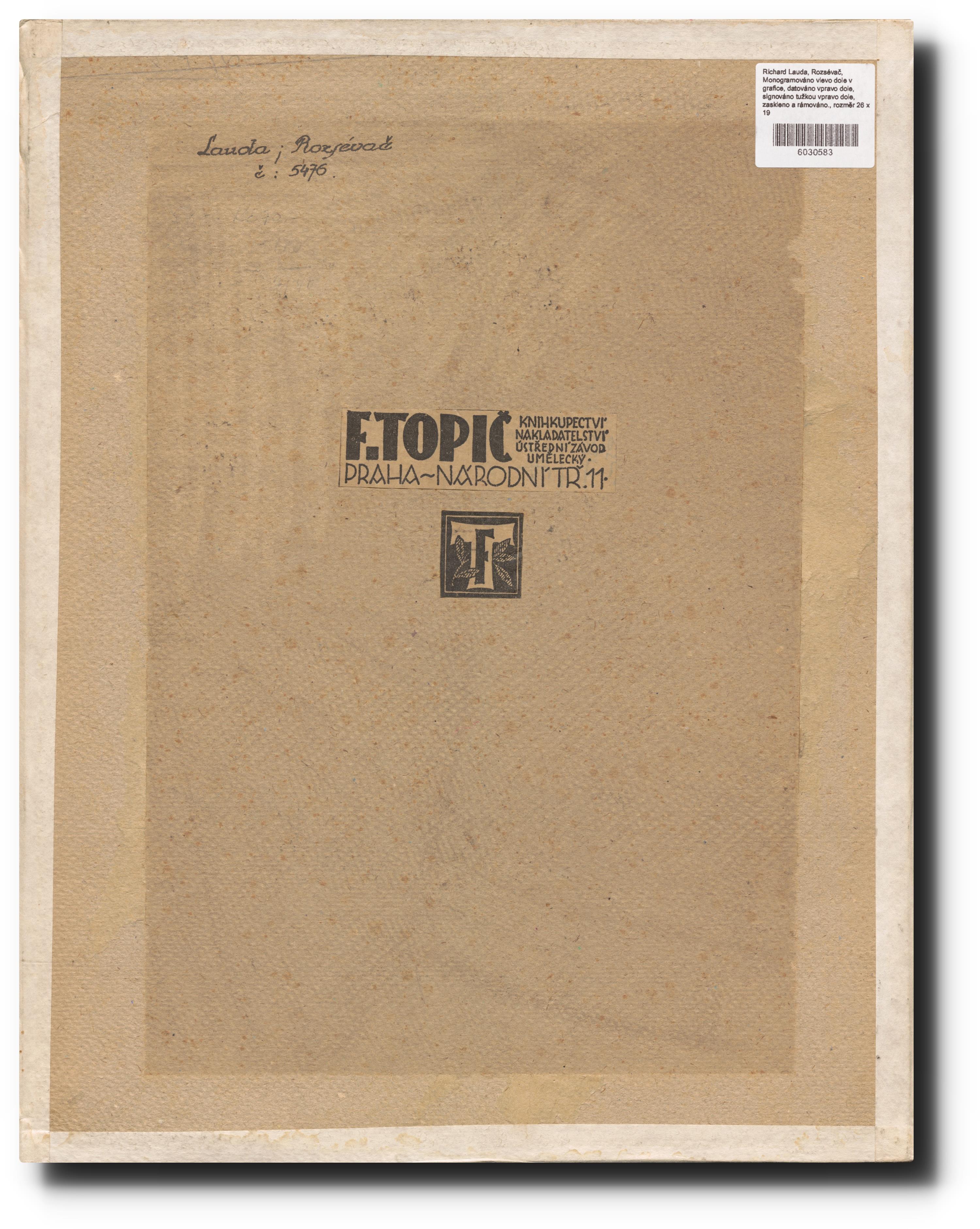 Monogramováno vlevo dole v grafice, datováno vpravo dole, signováno tužkou vpravo dole, zaskleno a rámováno.