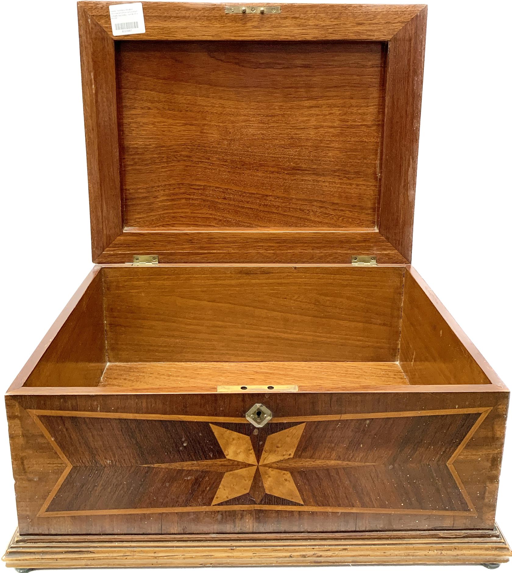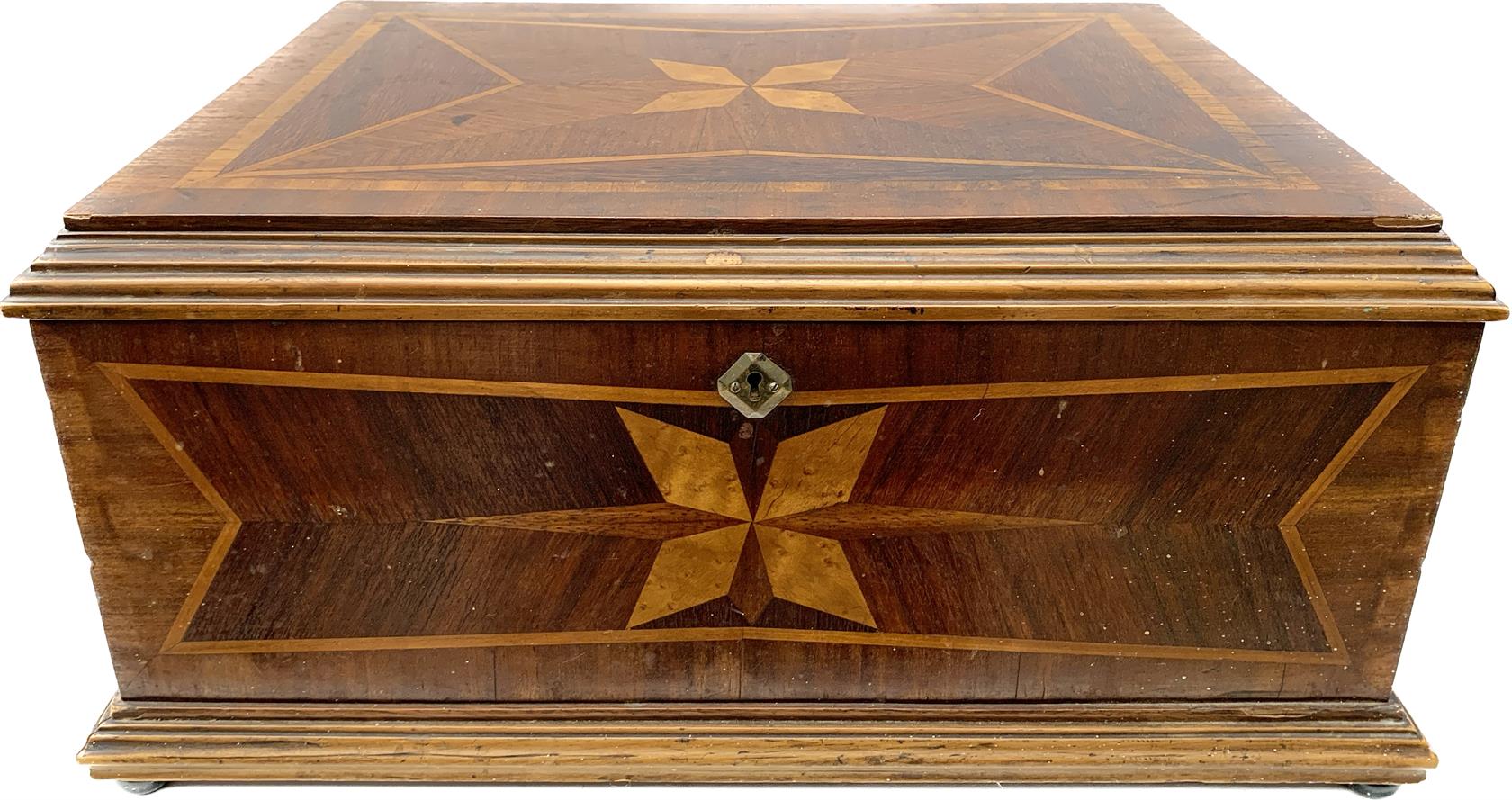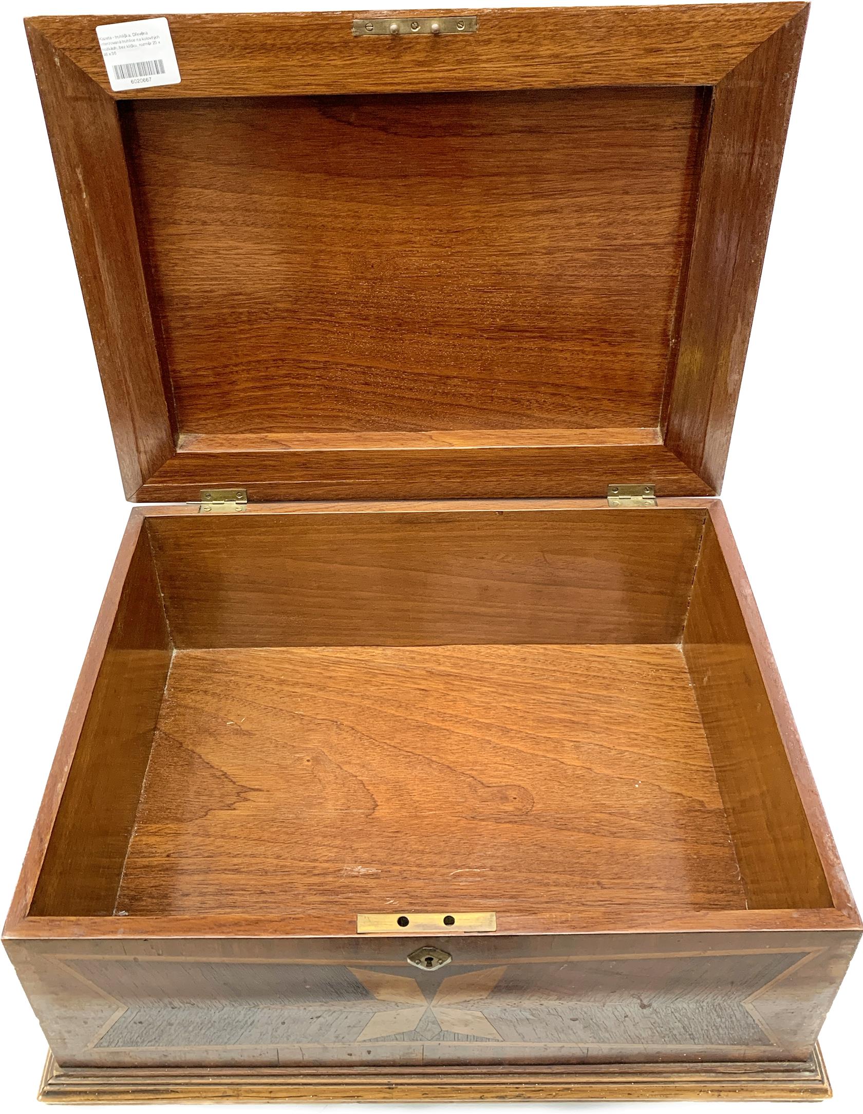 Dřevěná interzovaná truhlice na kulovitých nožkách, bez klíčku