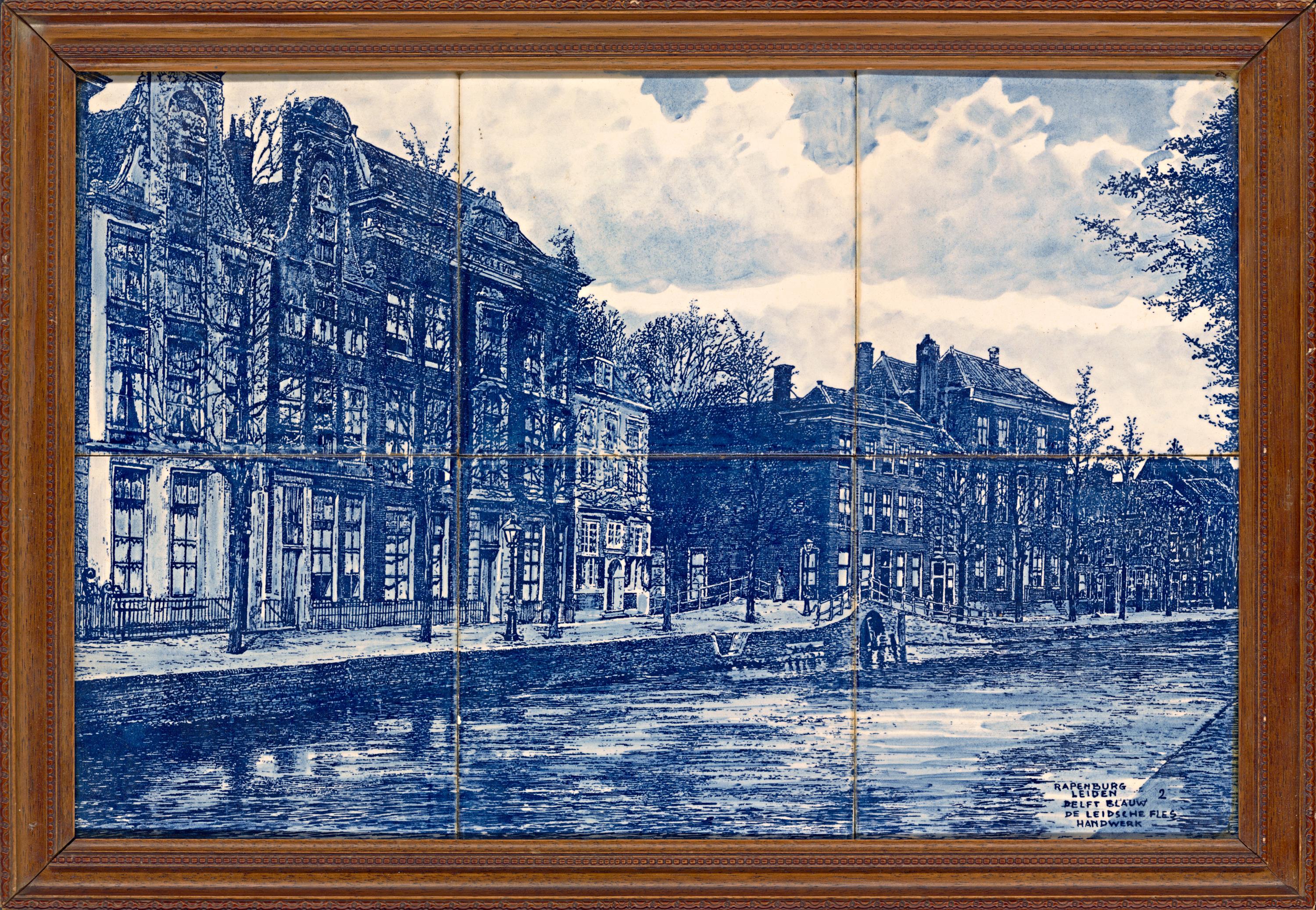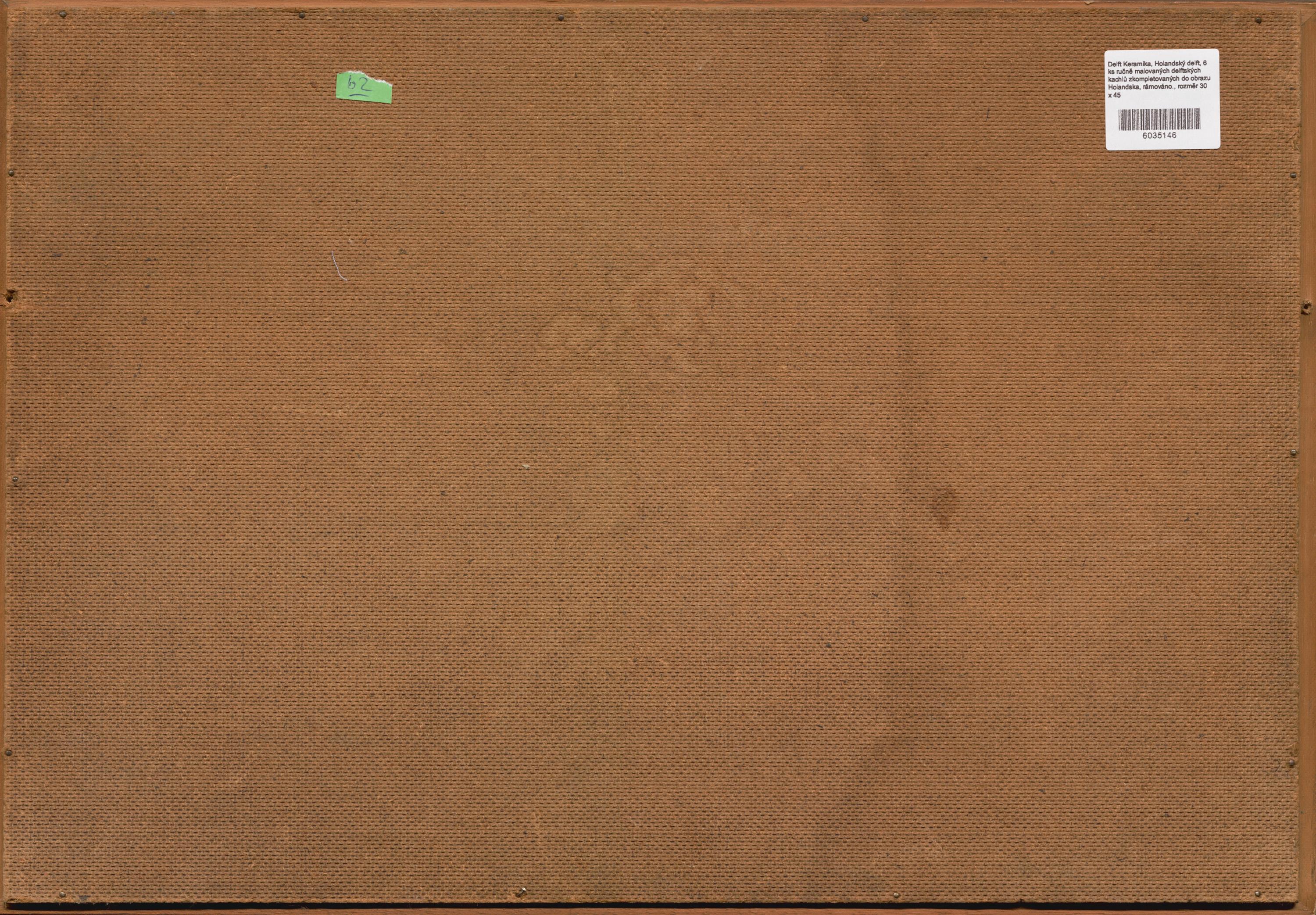 6 ks ručně malovaných delftských kachlů zkompletovaných do obrazu, rámováno.