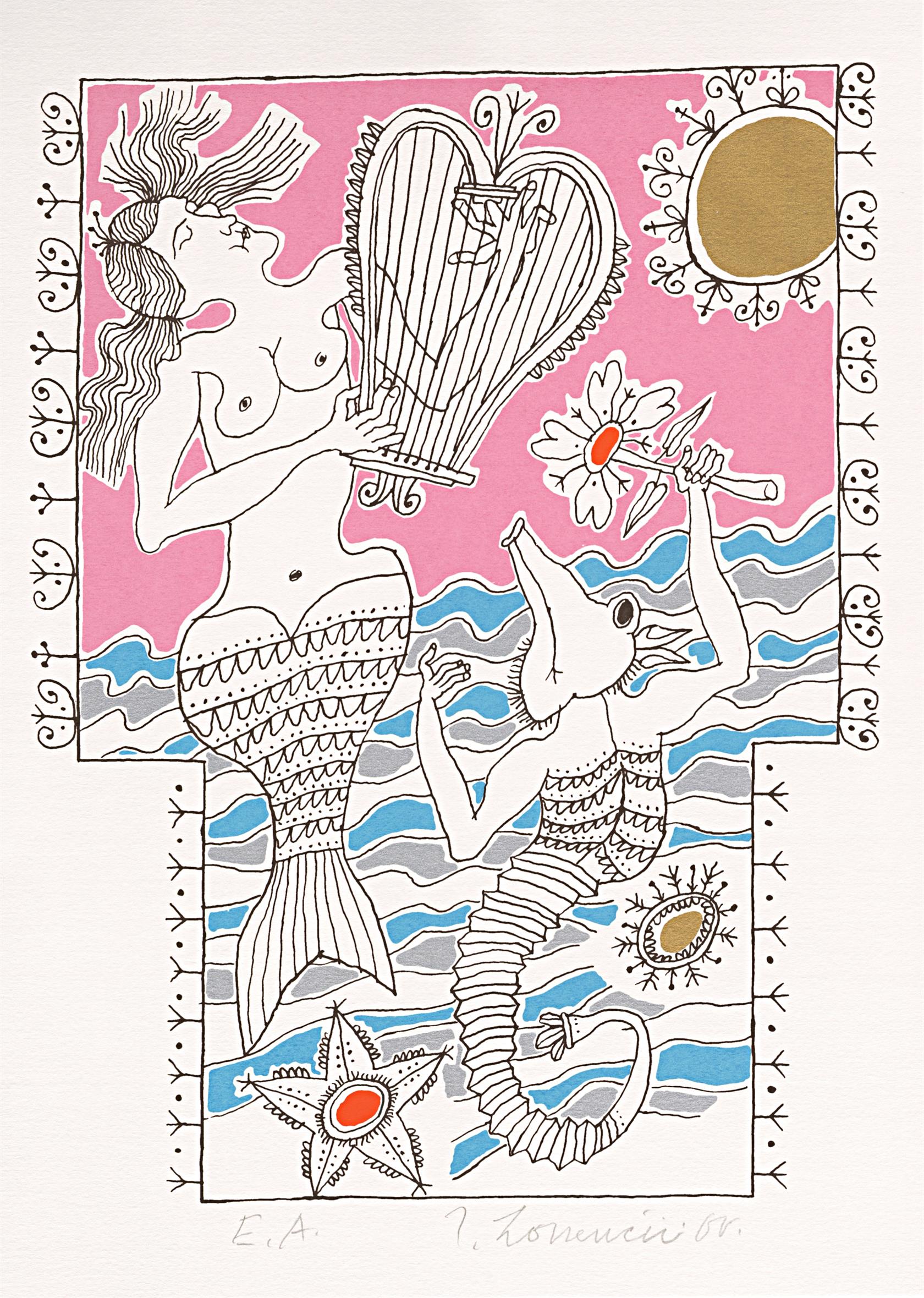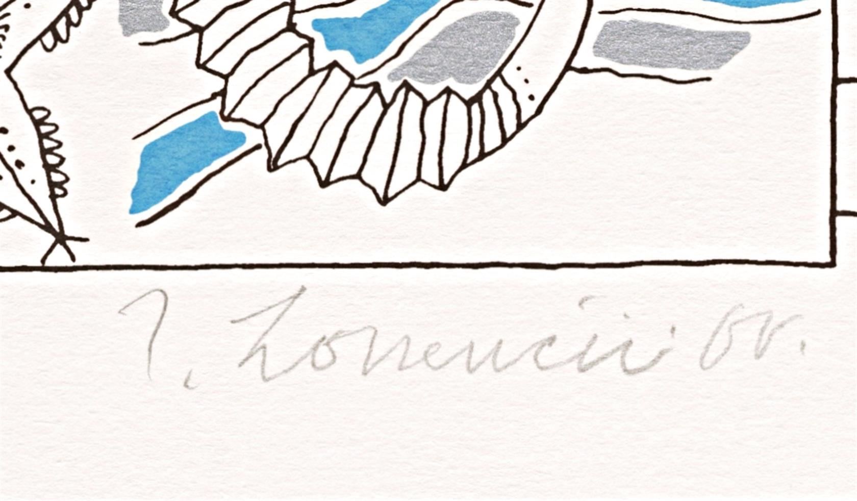 vlevo dole zkratka pro autorský tisk, vpravo dole signováno, volný list