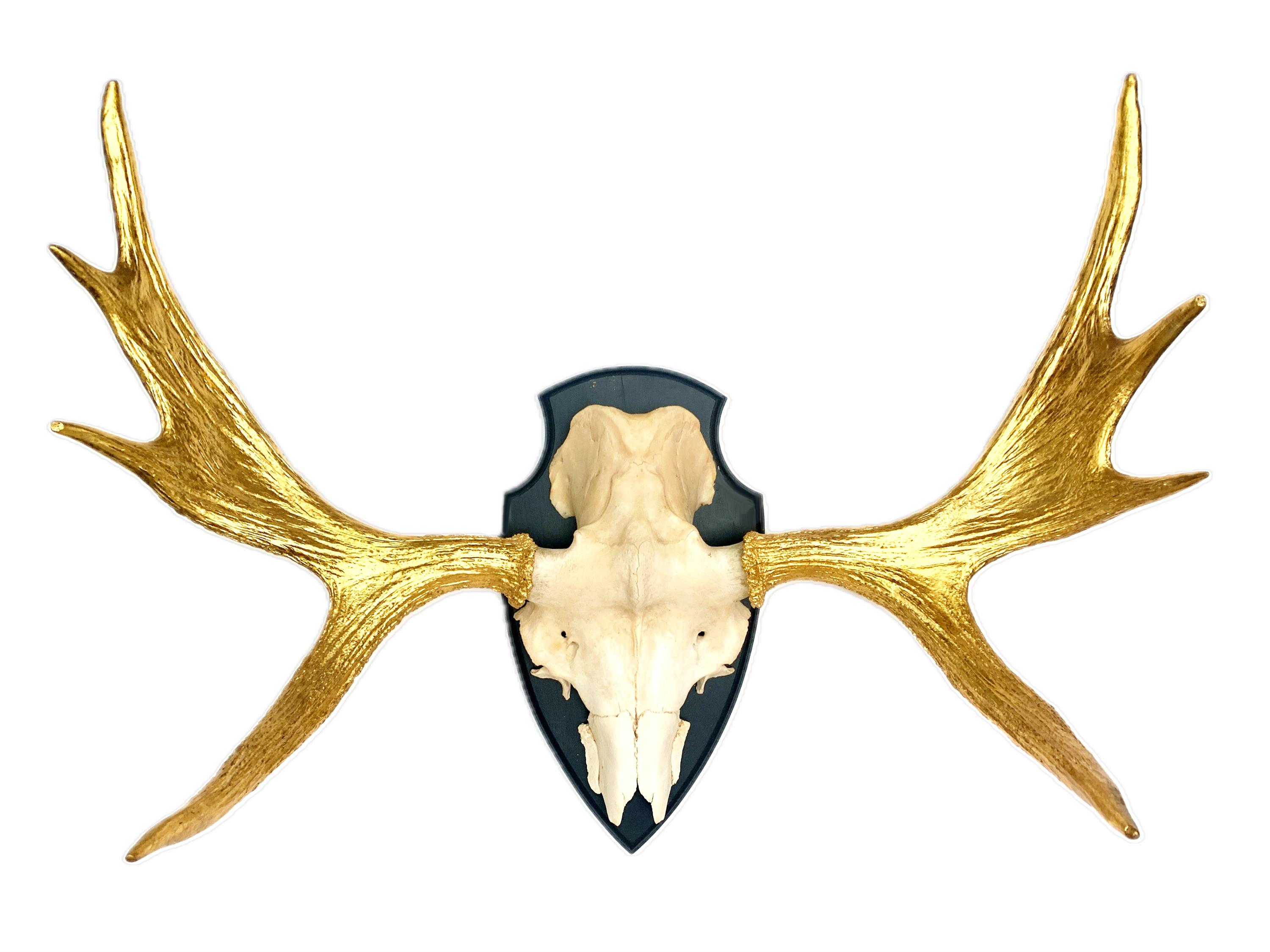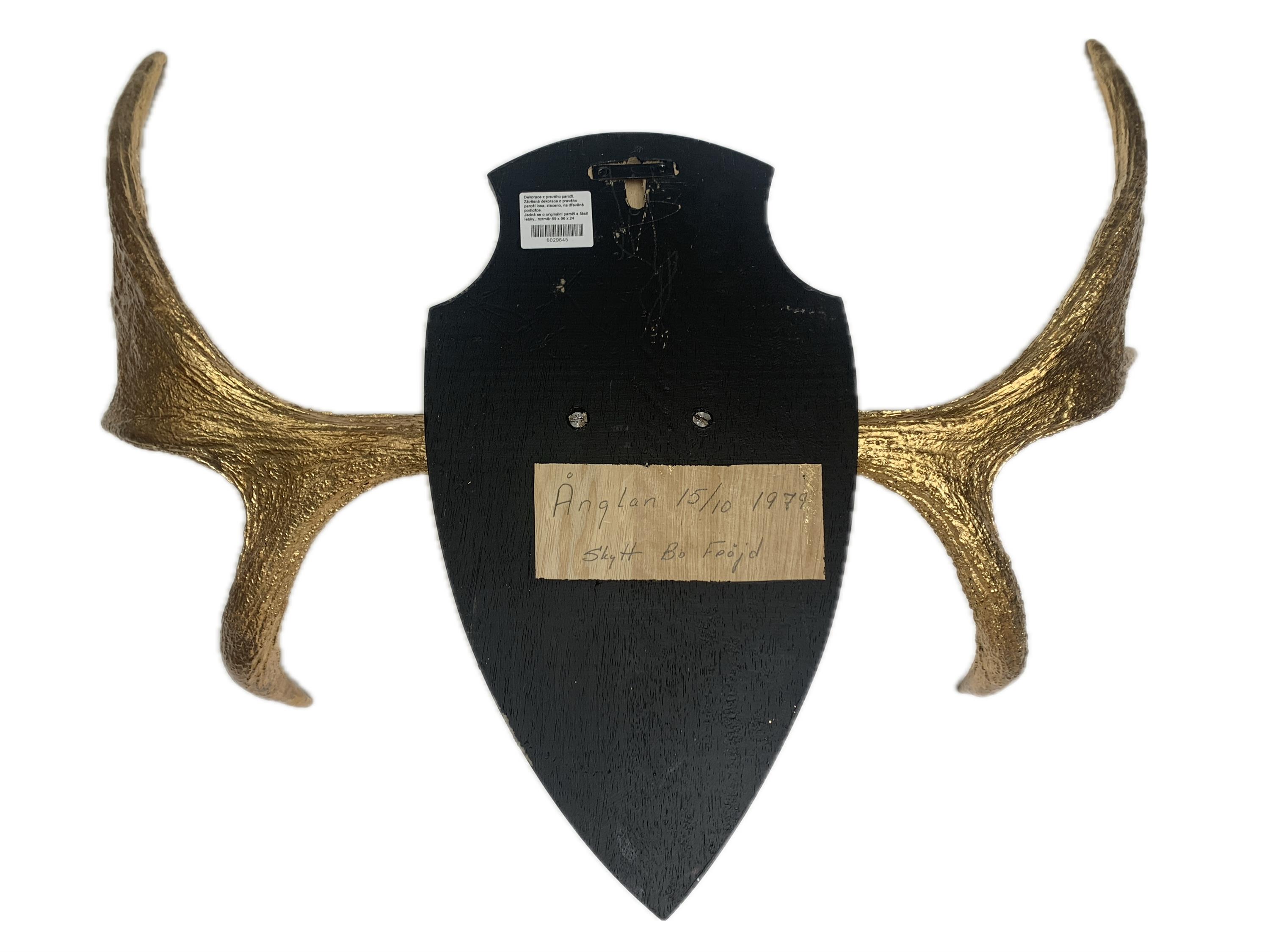 Závěsná dekorace z pravého paroží losa, zlaceno, na dřevěné podložce.