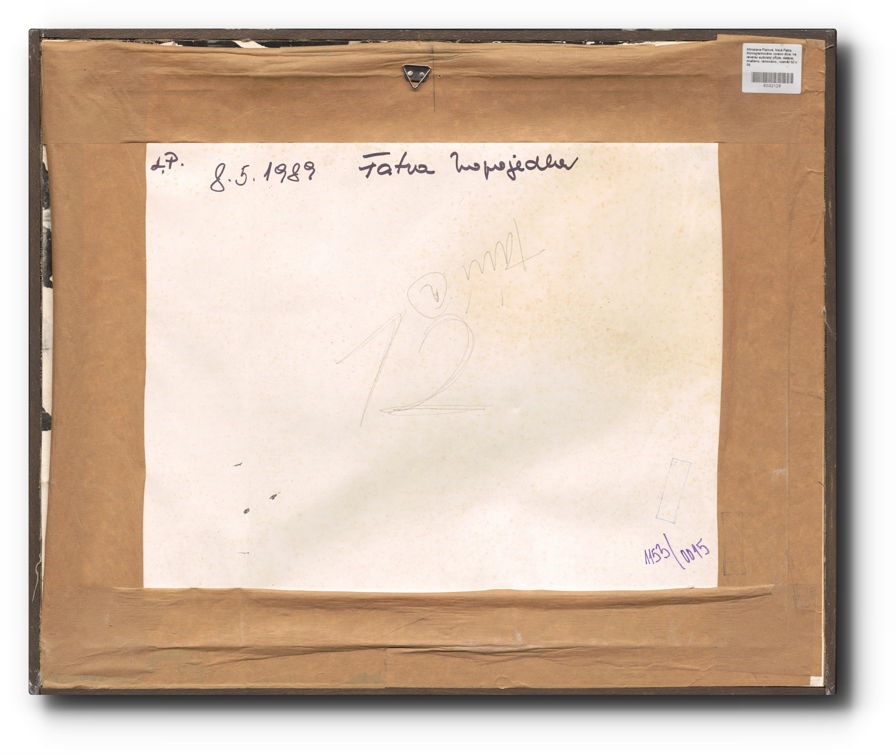 Monogramováno vpravo dole, na reversu autorský přípis, datace, rámováno.