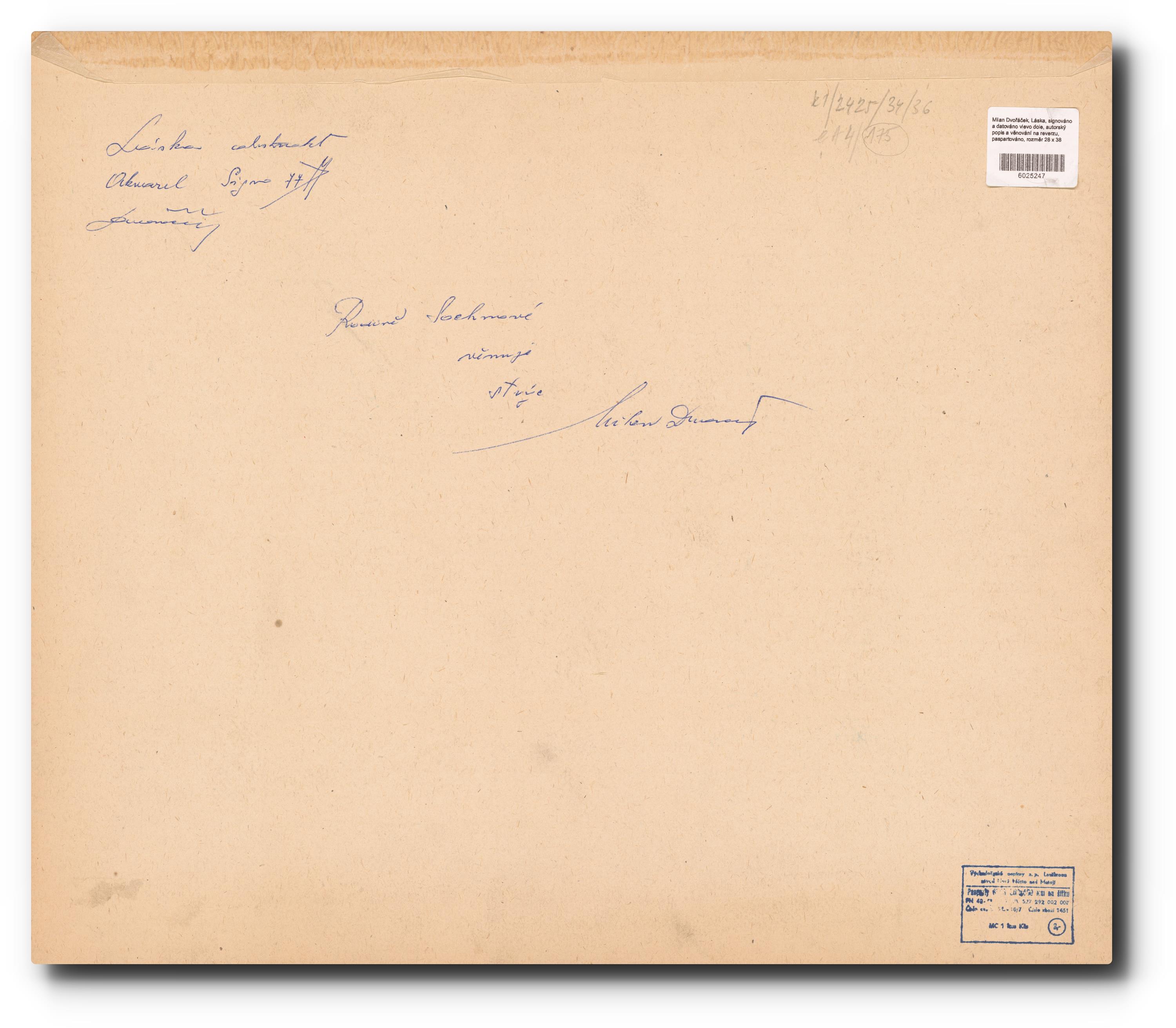 signováno a datováno vlevo dole, autorský popis a věnování na reverzu, paspartováno