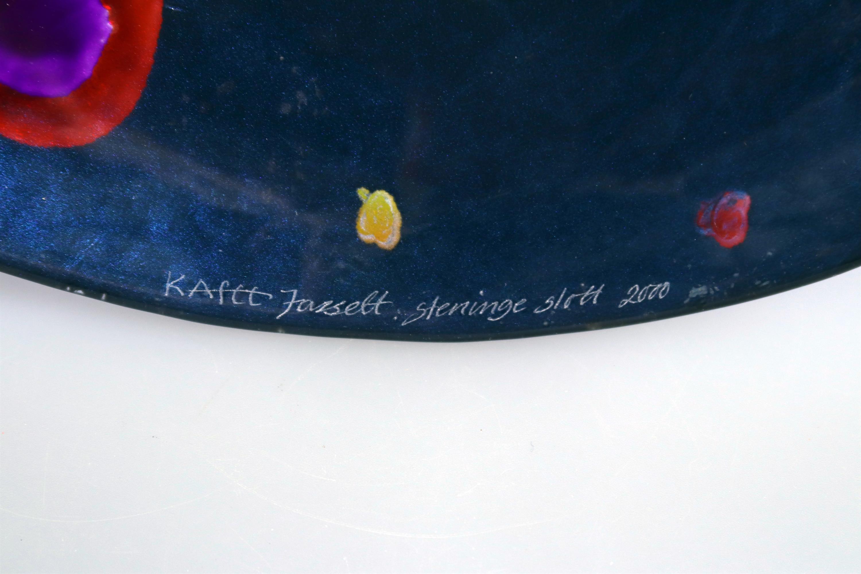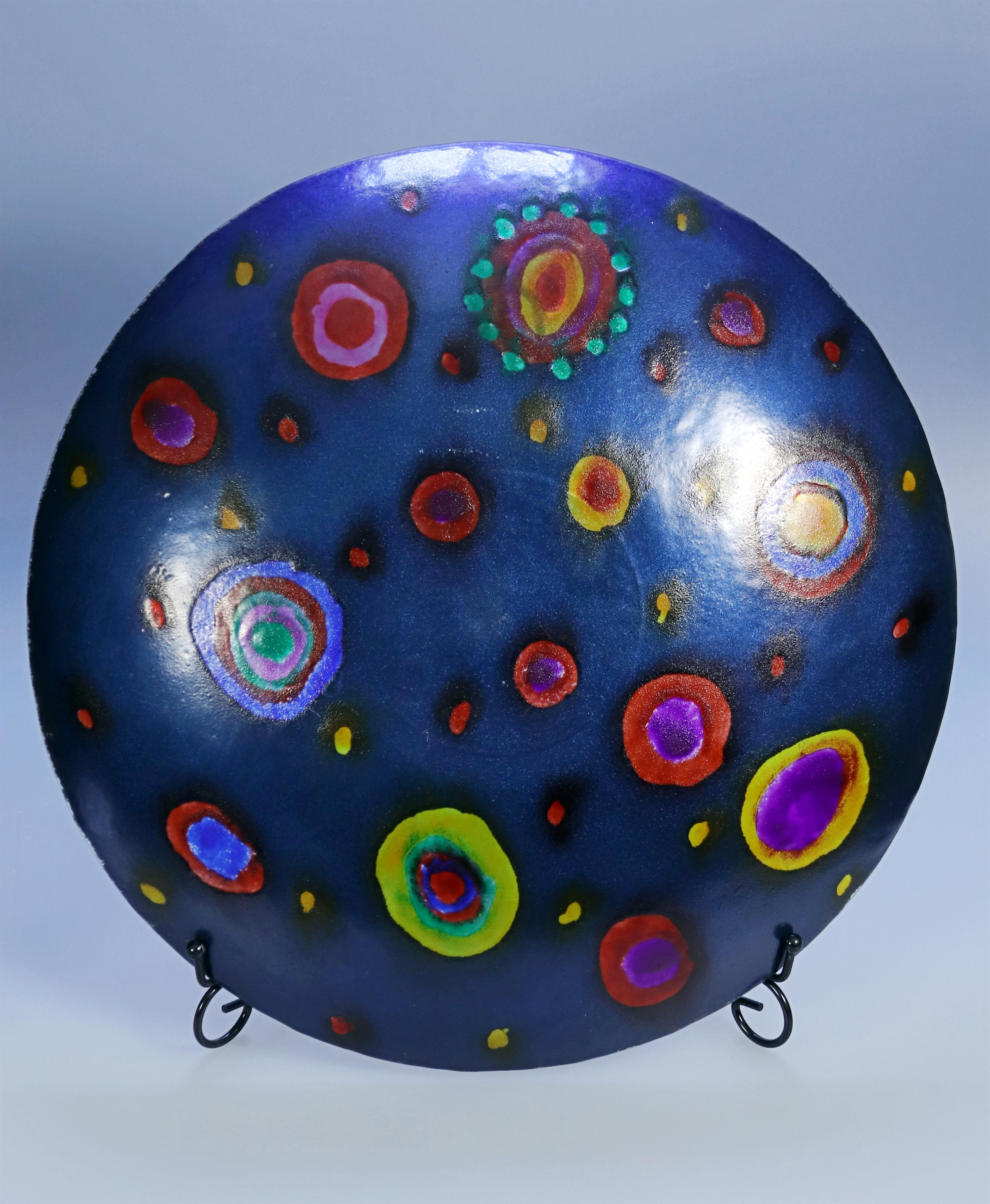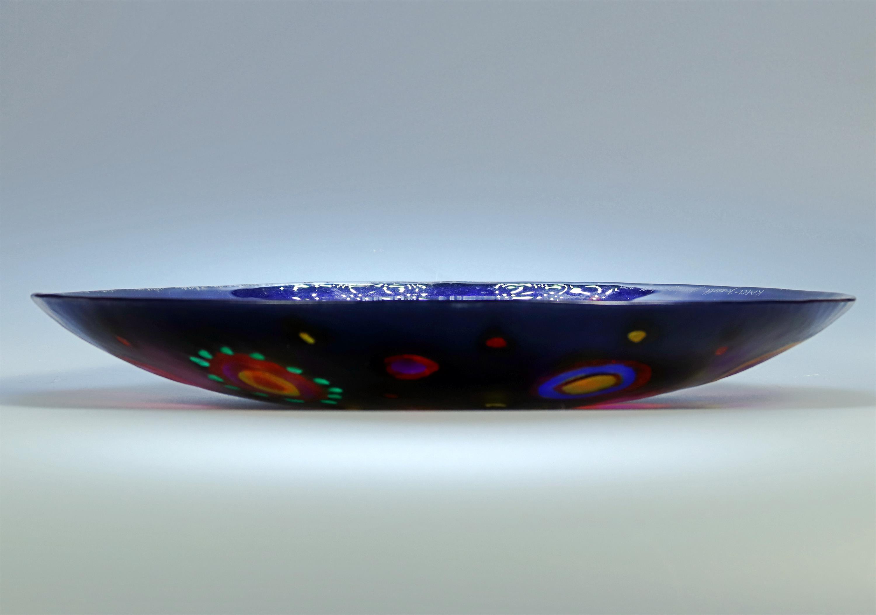 7. Skleněná modrá mísa s barevnými kruhy