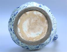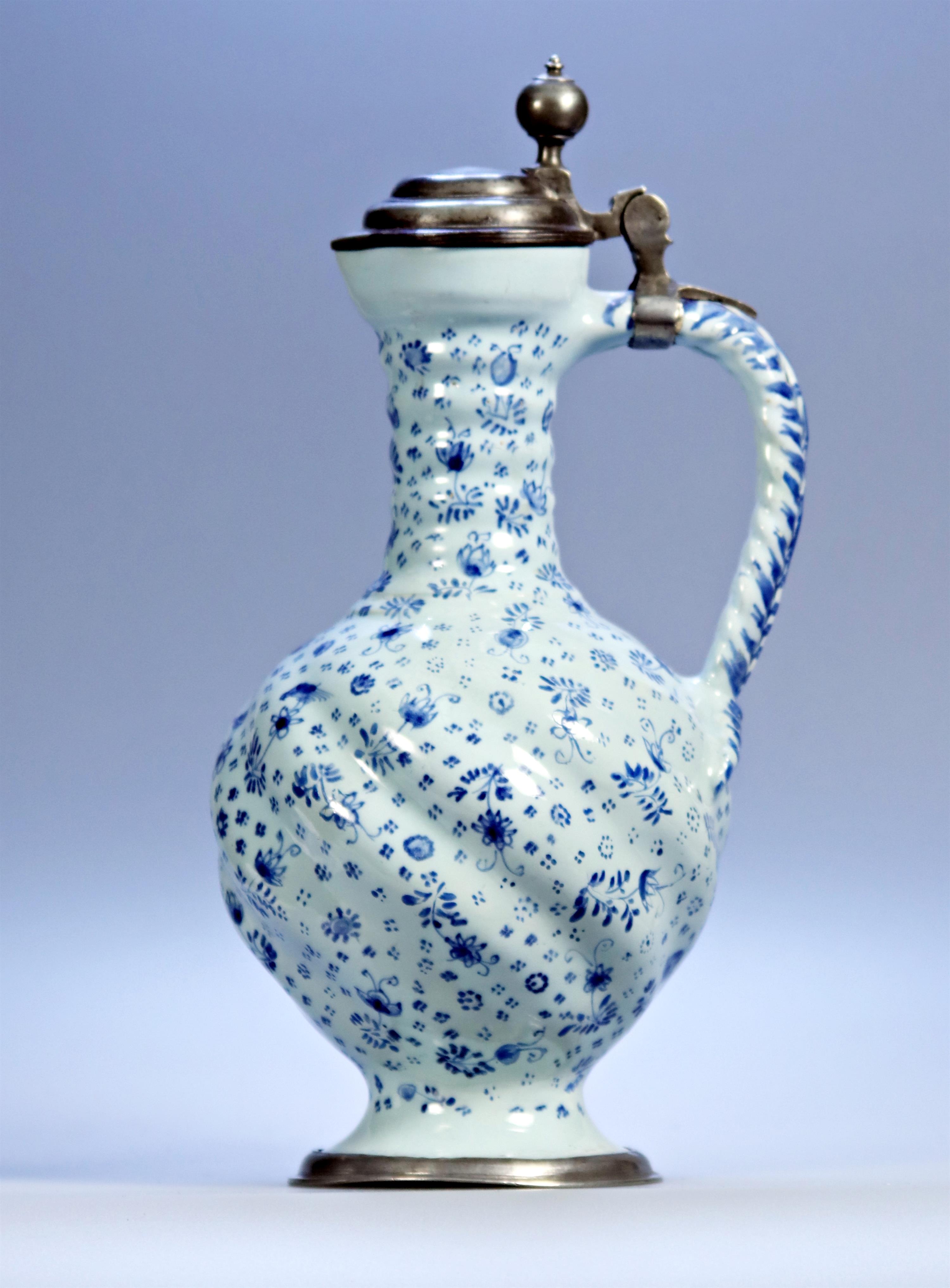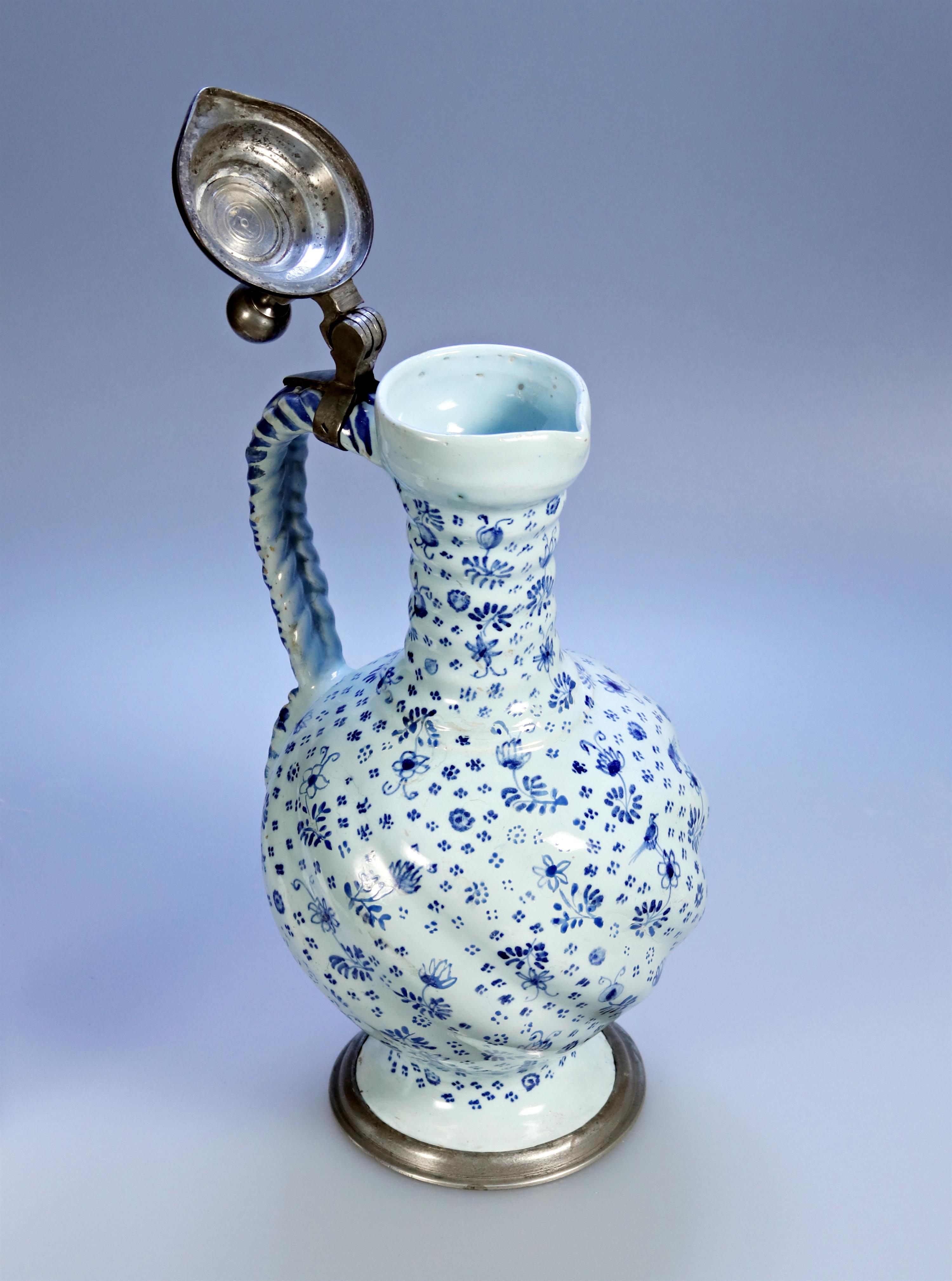 keramický džbán s modrým malováním a cínovým víčkem