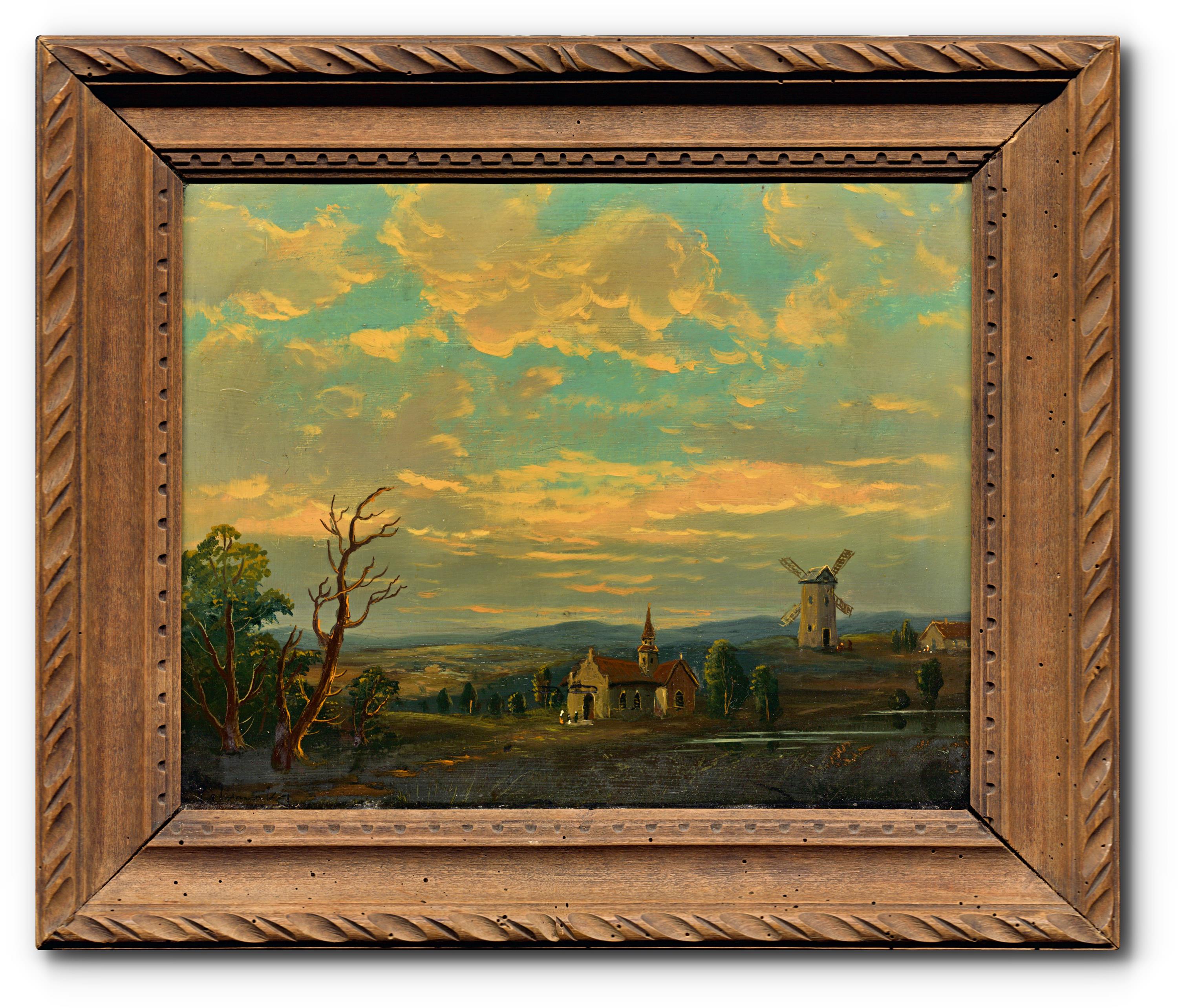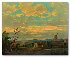 Krajina s větrným mlýnem a kostelem