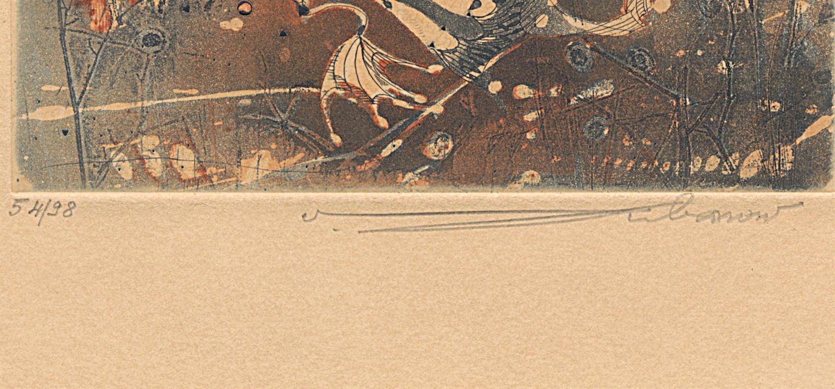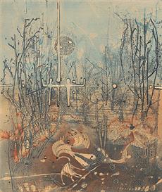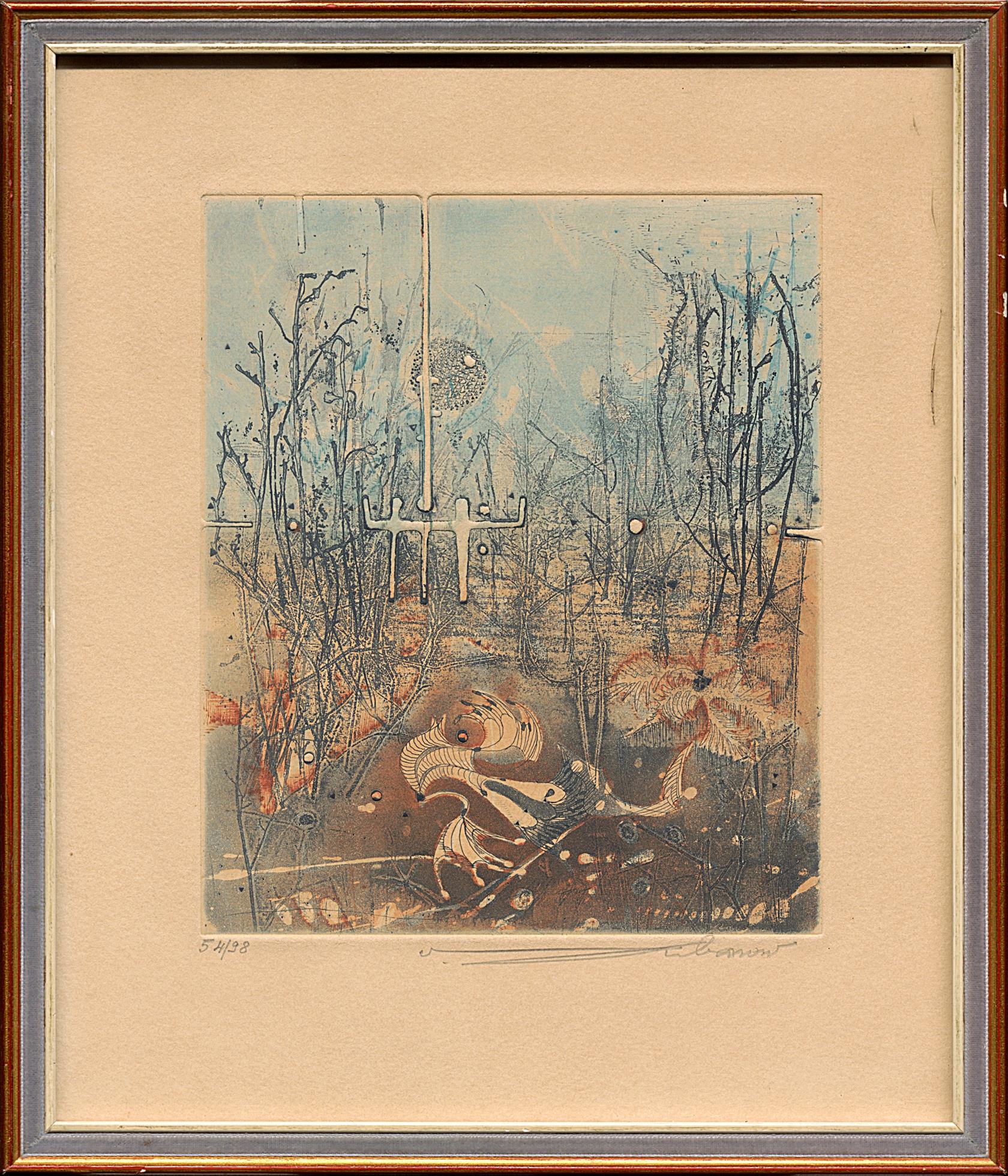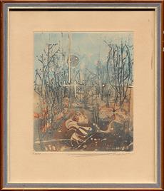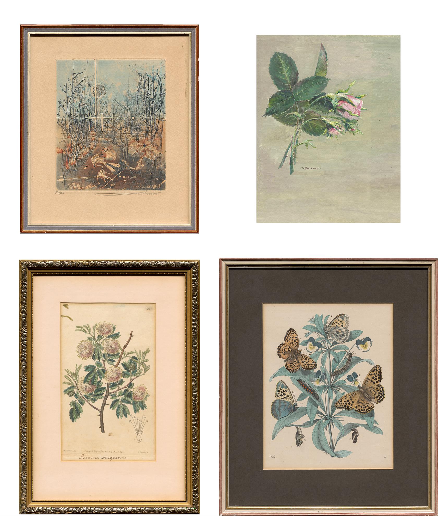 2 grafiky, jedna malba a tisk, různí autoři, dvě signované, dvě pasparty, vše zaskleno a rámováno