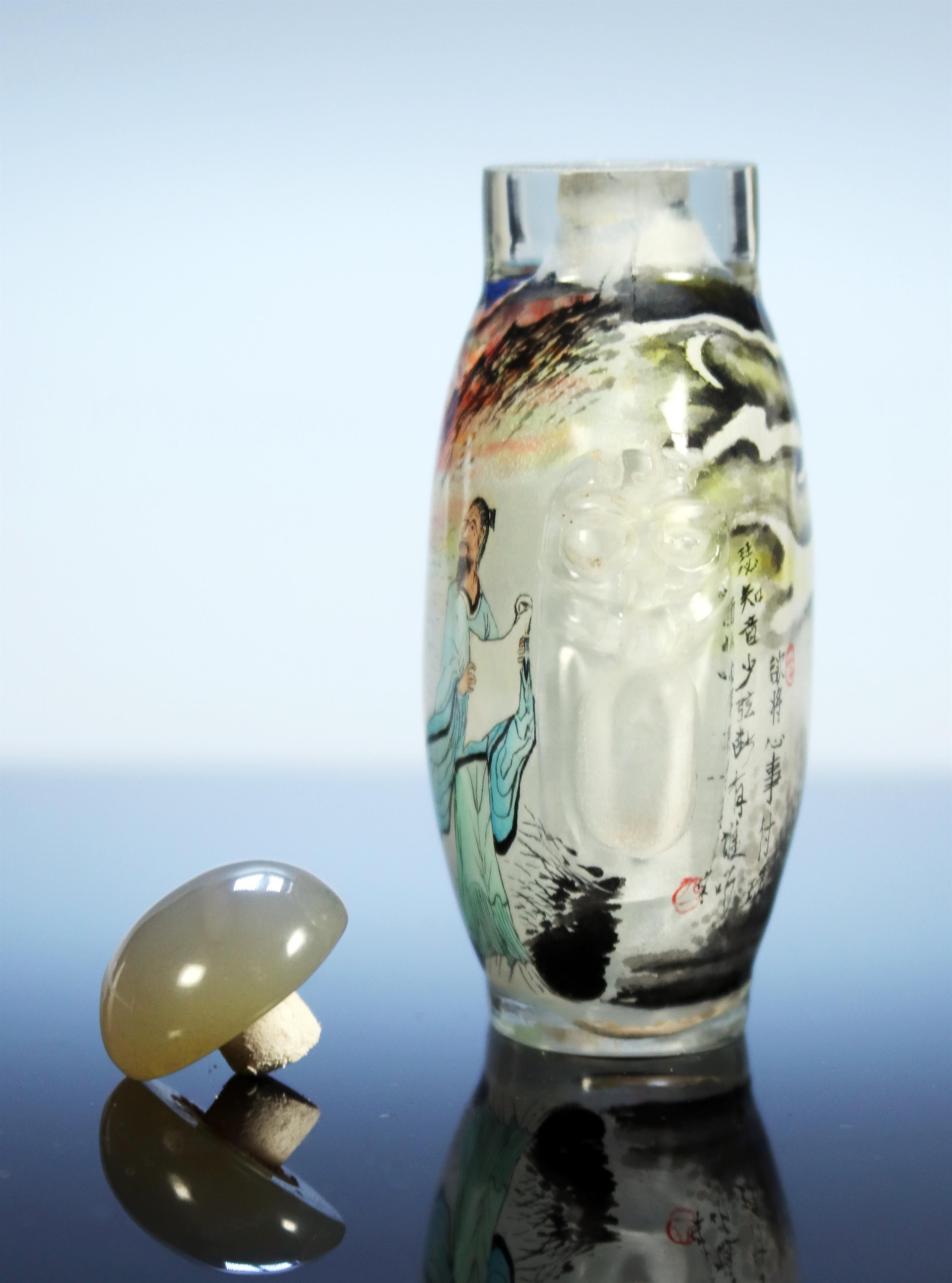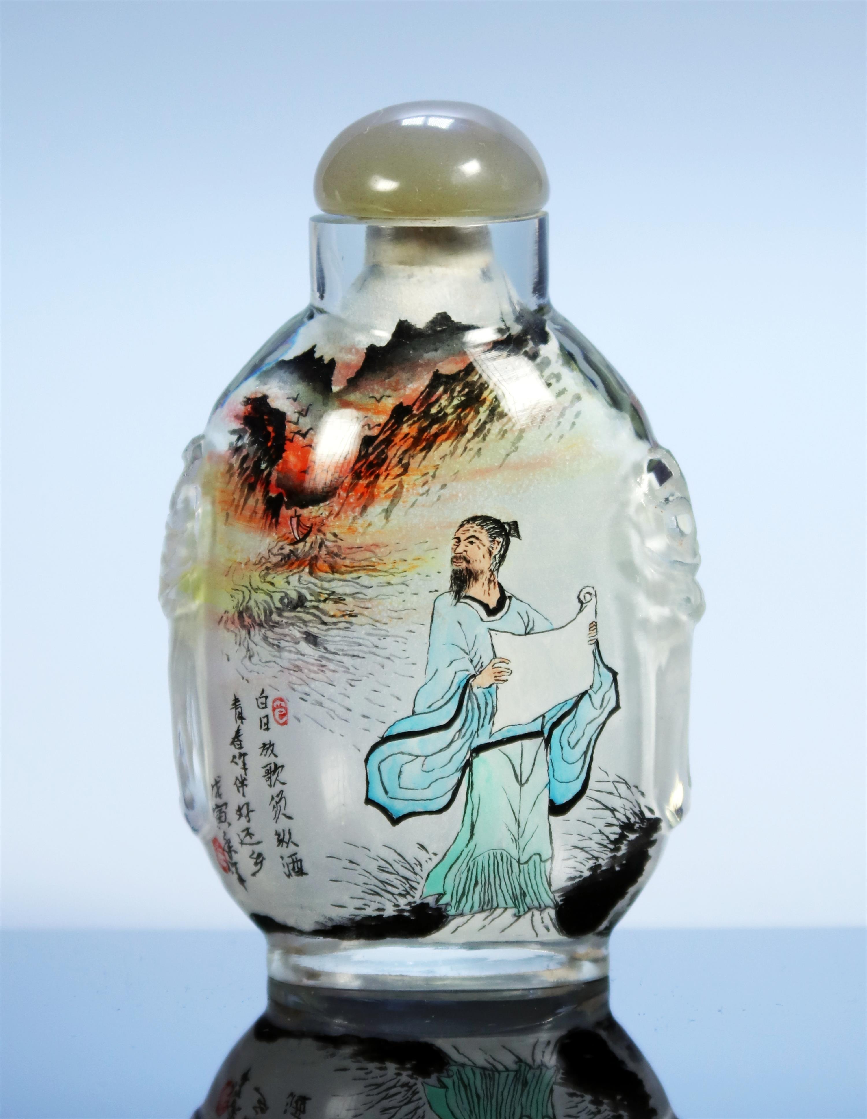 Šňupací lahvička s čínskou kaligrafií, která obsahuje verše z klasické čínské poezie.