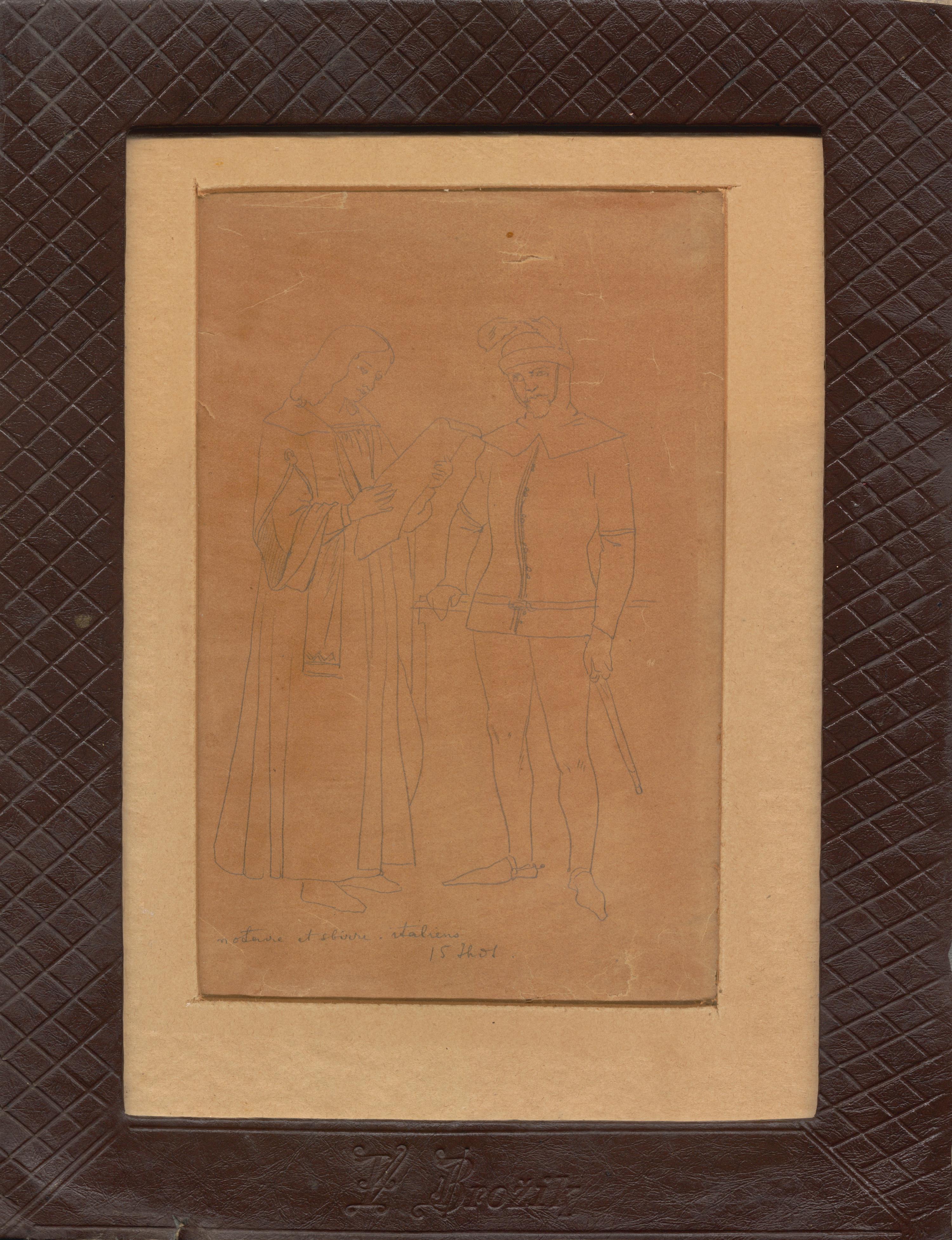 Přisouzeno autorovi, na koženém rámu vyraženo V. Brožík, vlevo dole popsáno, zaskleno a rámováno.