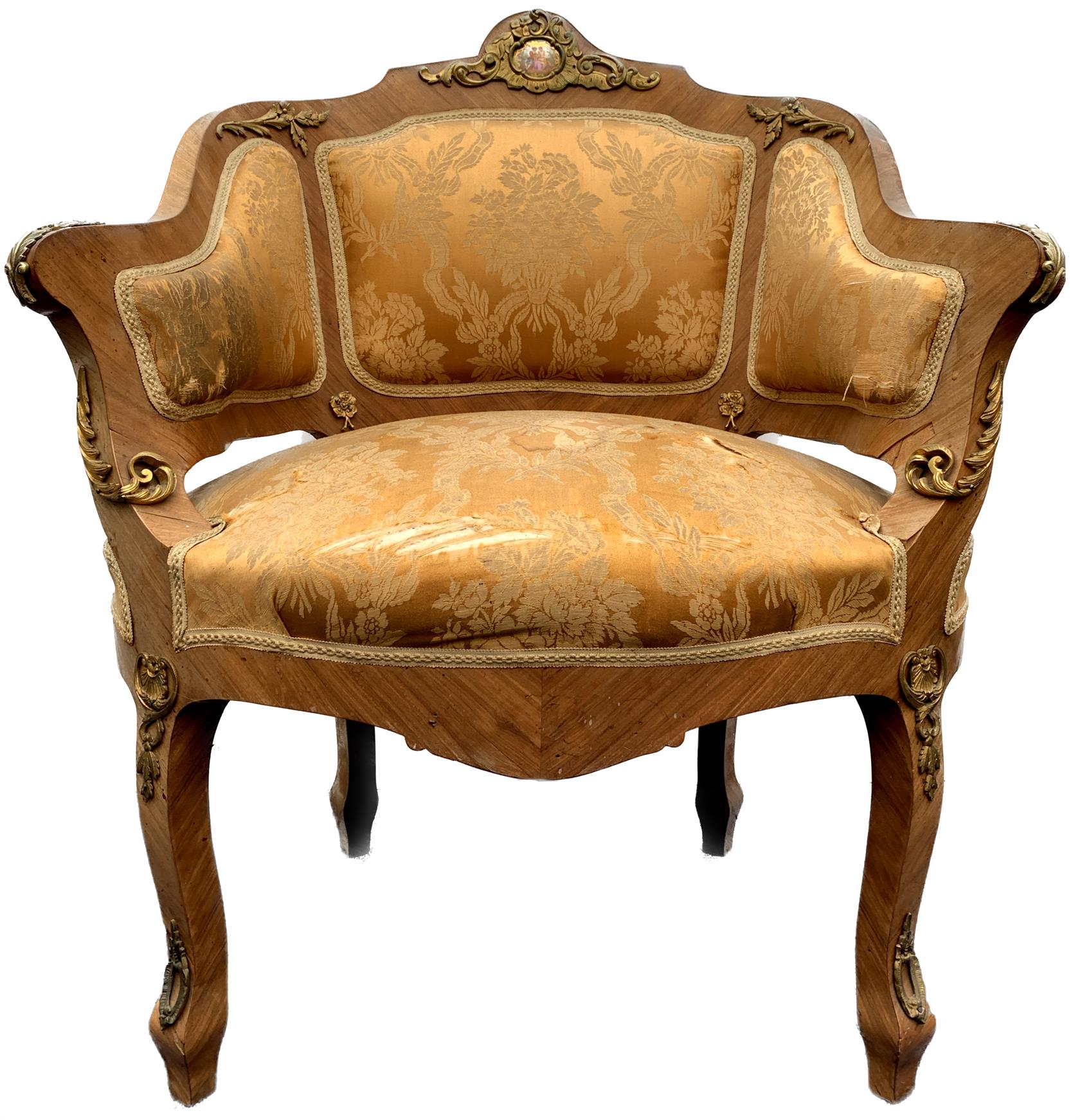 Zdobeno intarzií, mosaznými ozdobami a ručně malovanými medailony na porcelánu.