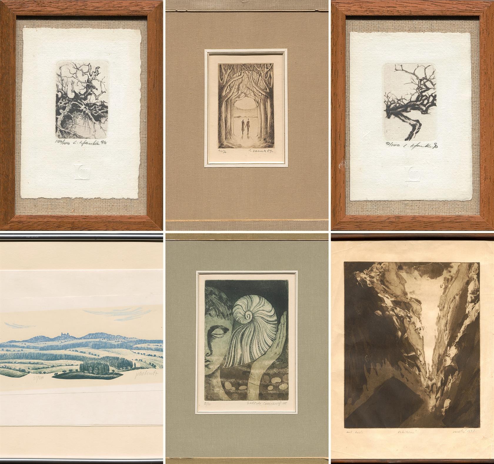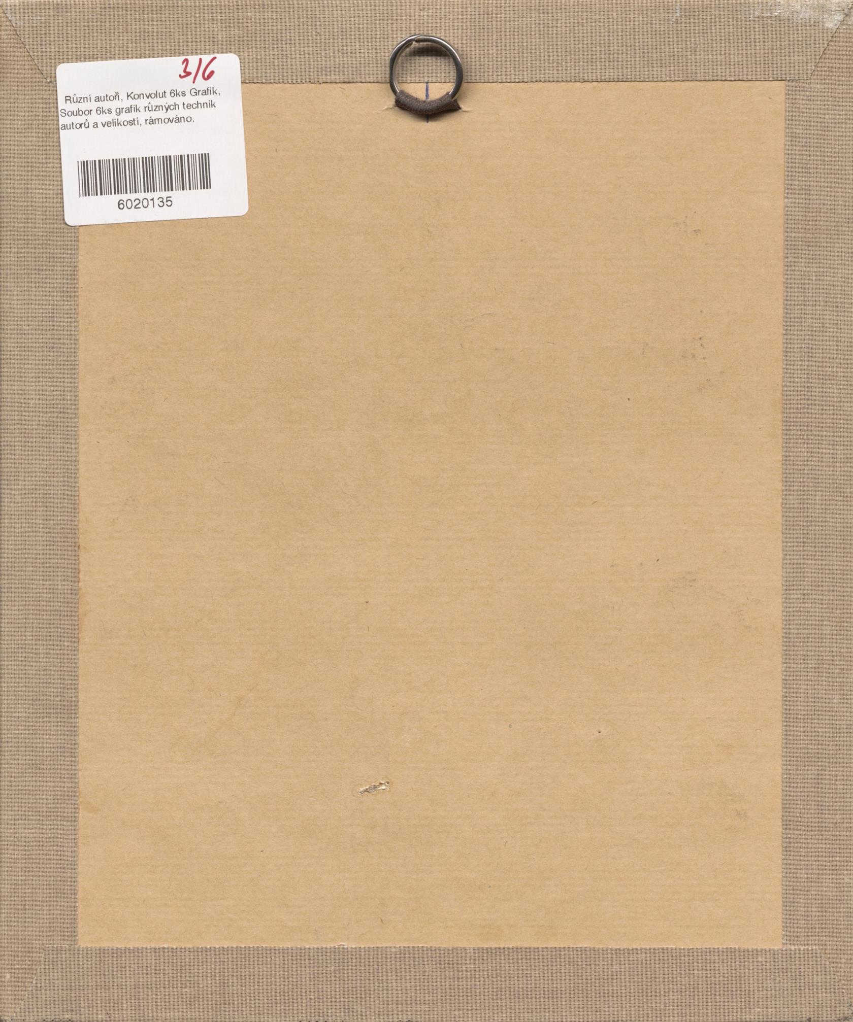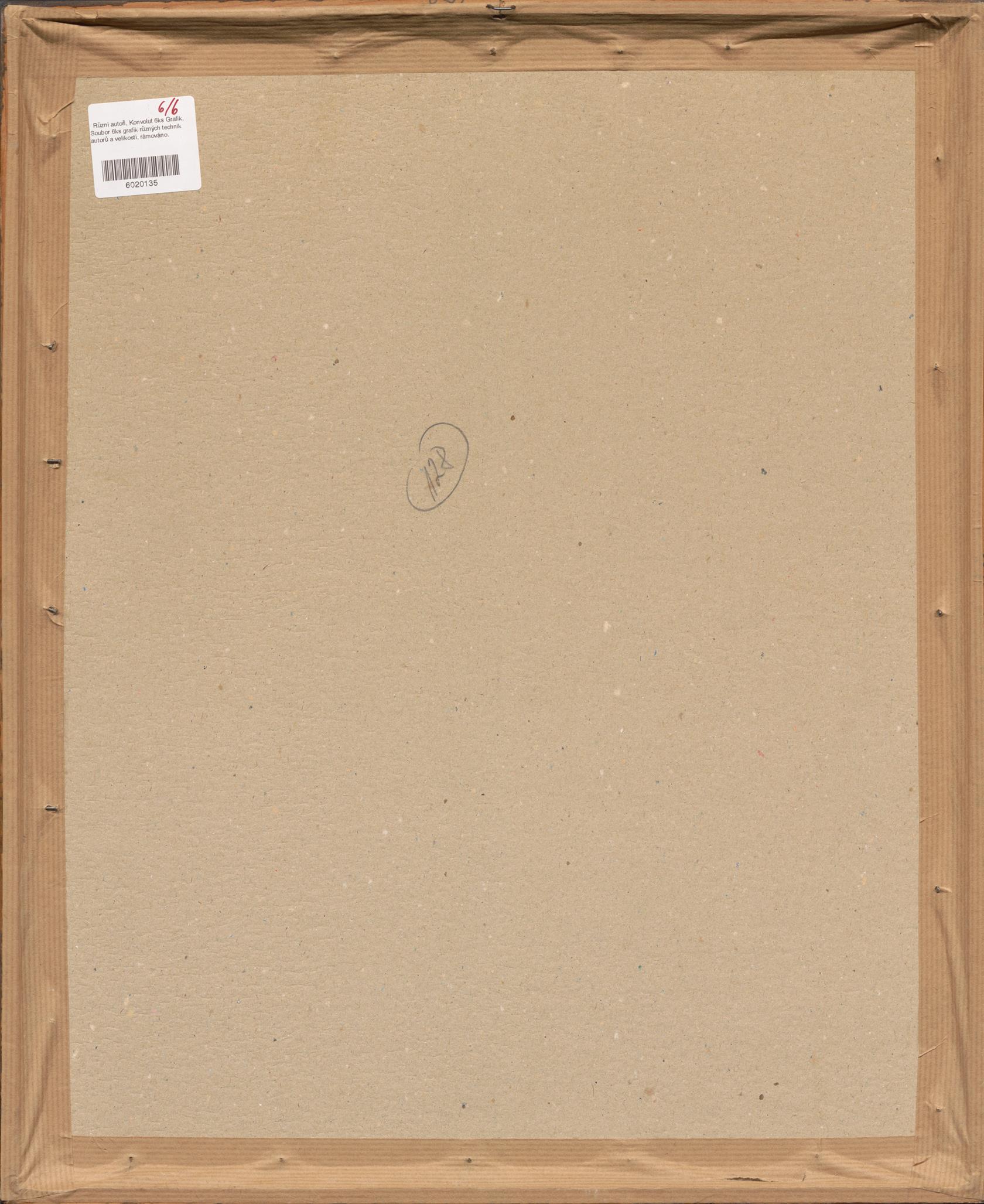 Soubor 6ks grafik různých technik autorů a velikostí, rámováno.