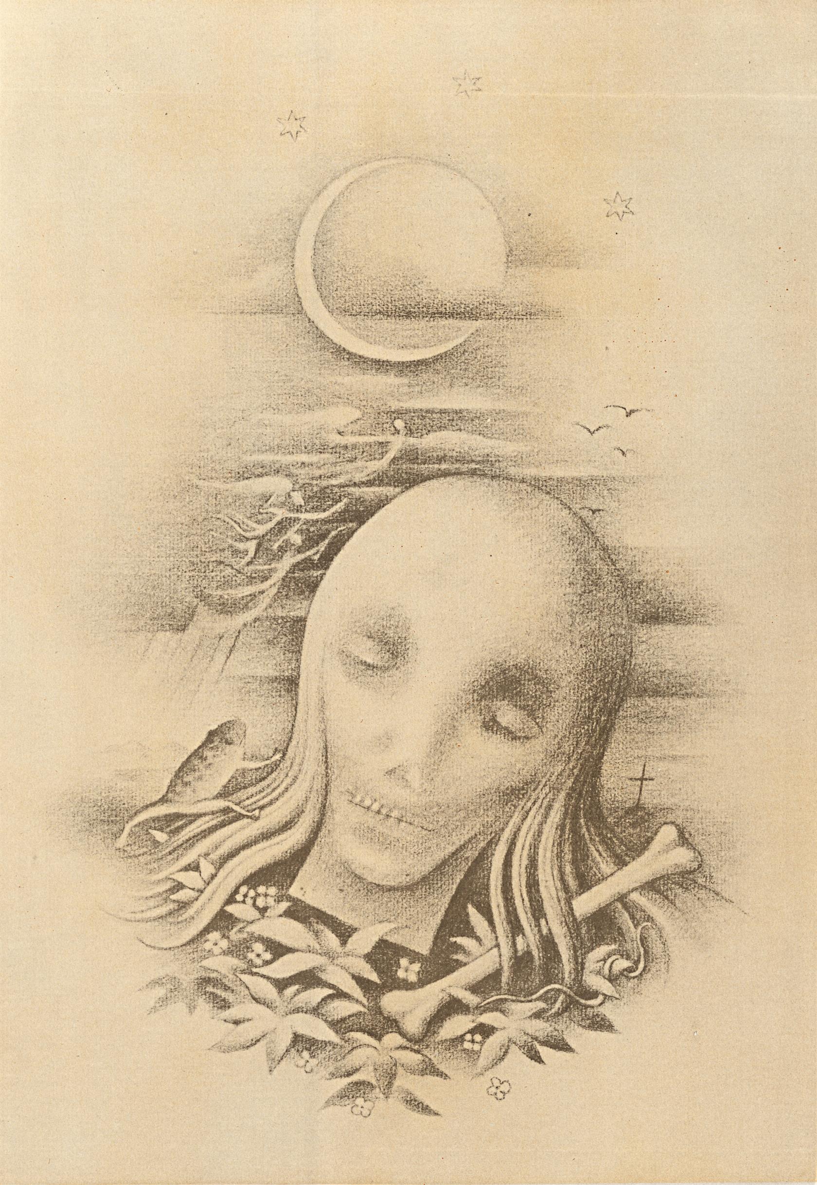 Karel Hynek Mácha: Máj - Intermezzo I. ilustrace ke knize, kterou vydalo Aventinum nakladatelství, dr. Otakara Štrocha - Mariena, k vánocům roku 1924. Vydalo Aventinumu příležitosti výstavy Aventinská mansarda - Otakar Štroch-Marien a výtvarné umění v Praze 1990. Světlotiskem vytiskla Poligrafia Sadská. Volný list, monogramováno vpravo dole v grafice.