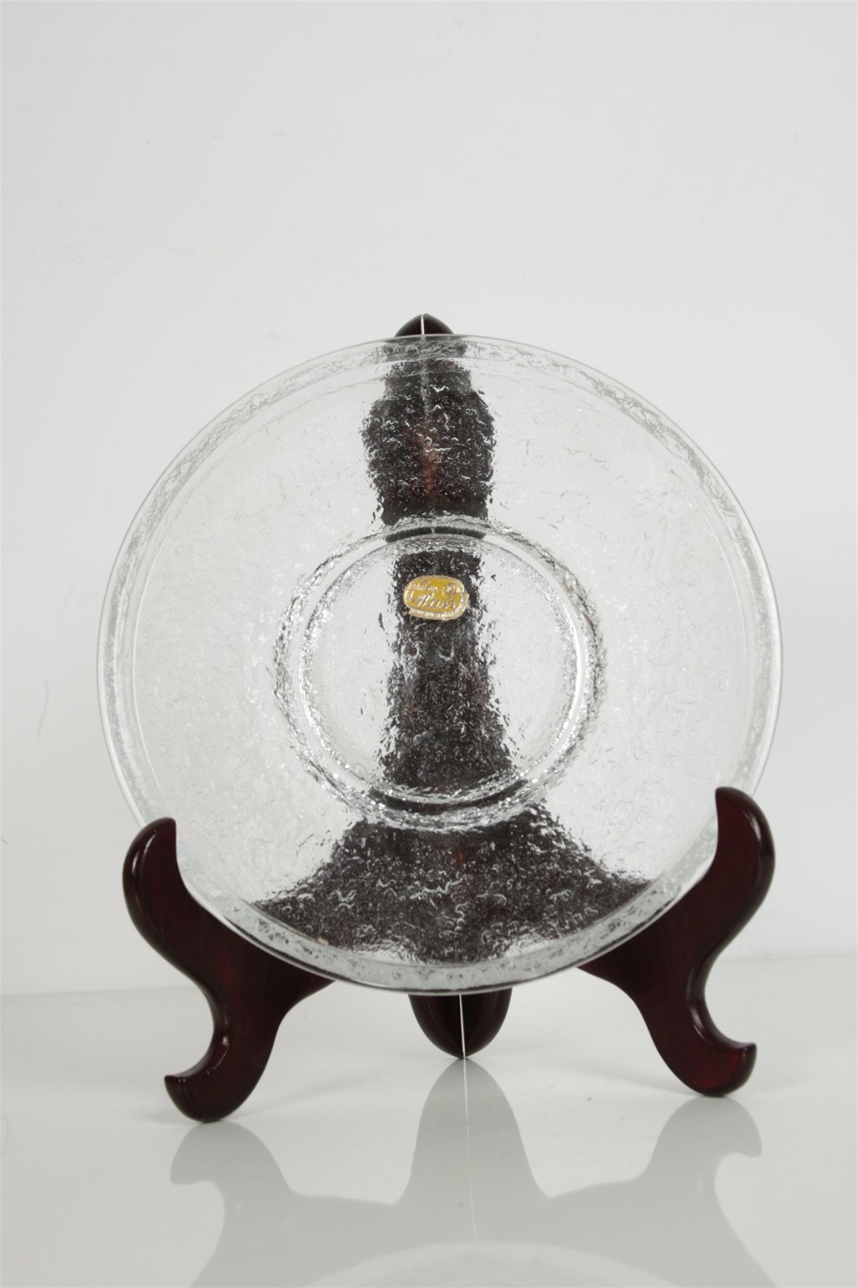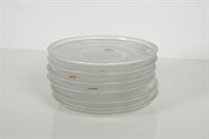 soubor dezertních talířků z lisovaného čirého československého skla, všechny originálně značené původní výrobní samolepkou, nepoužité
