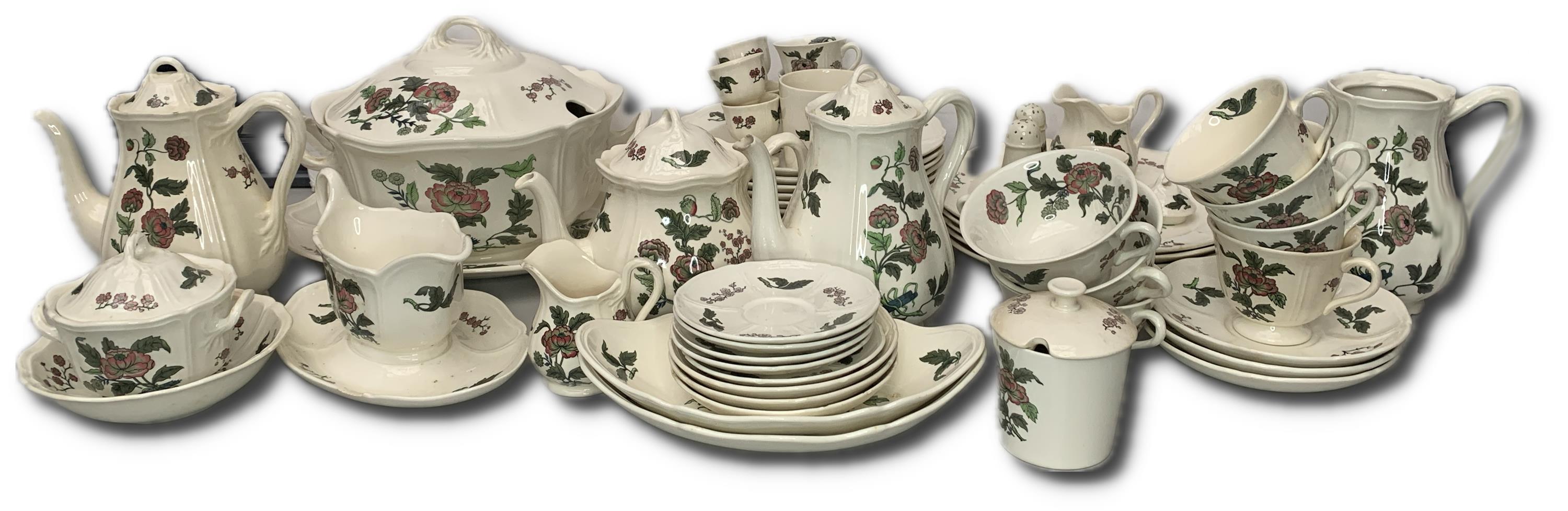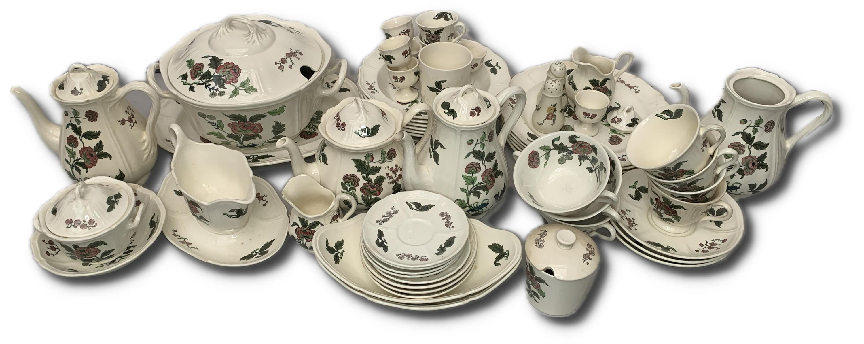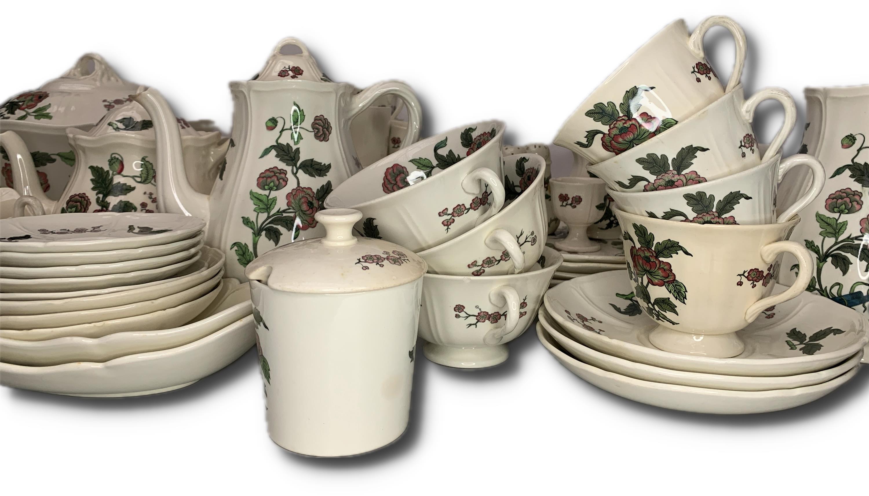 neúplný jídelní, čajový a kávový servis, značeno Mandrarin Pattern N9TK441, Wedgwood Barlaston Made in England, Queens Shape as designed for Queen Charlotte in 1765, malovaný rostlinný dekor, obsahuje: 5 velkých mělkých talířů, 6 malých mělkých talířů, 6 hlubokých talířů, 1 čajová konvice, 2 kávové konvice, 3 bujon šálek, 6ks stojan na vajíčko, pepřenka a solnička, 2 mléčenky, 3 cukřenky, 4 hrníčky, 1 omáčník, 1 polévková mísa, 1 velká mísa, 5 podšálků, 3 větší podšálky, 2 malé mísy, 1 mísa, 3 středně velké talířky, 2 hrníčky na kávu